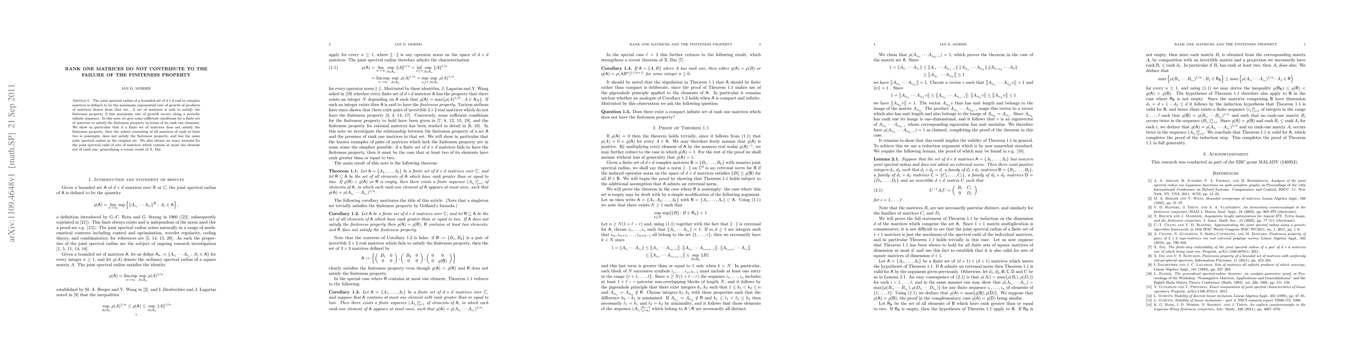 The joint spectral radius of a bounded set of d times d real or complex matrices is defined to be the maximum exponential rate of growth of products of matrices drawn from that set. A set of matrices is said to satisfy the finiteness property if this maximum rate of growth occurs along a periodic infinite sequence. In this note we give some sufficient conditions for a finite set of matrices to satisfy the finiteness property in terms of its rank one elements. We show in particular that if a finite set of matrices does not satisfy the finiteness property, then the subset consisting of all matrices of rank at least two is nonempty, does not satisfy the finiteness property, and has the same joint spectral radius as the original set. We also obtain an exact formula for the joint spectral radii of sets of matrices which contain at most one element not of rank one, generalising a recent result of X. Dai.