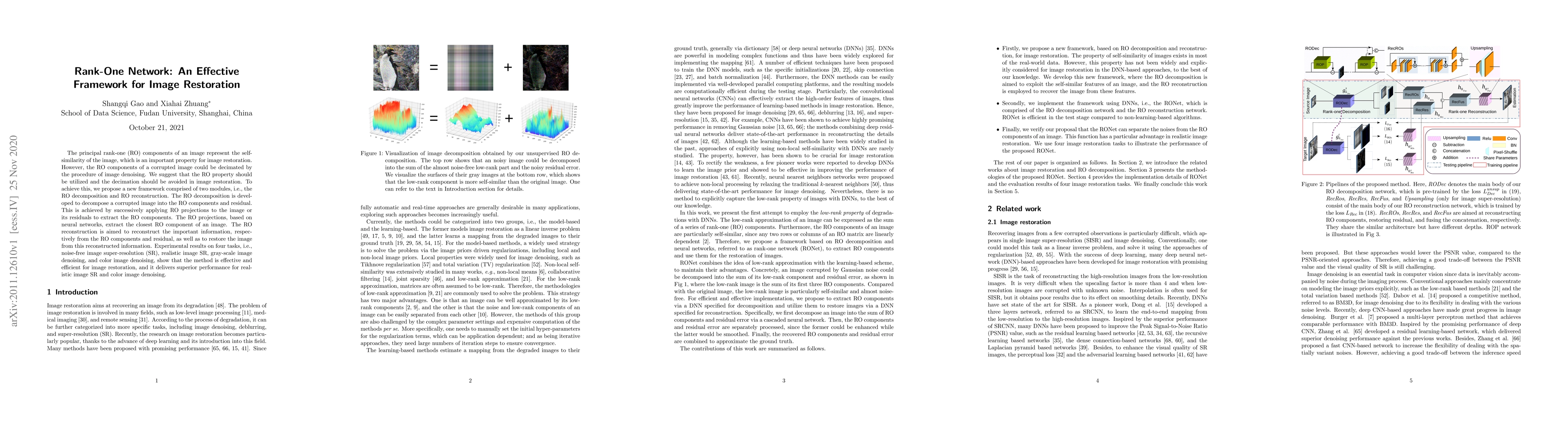 The paper proposes a Rank-One Network framework for image restoration that utilizes principal rank-one components to preserve self-similarity, avoiding decimation during denoising. The framework includes RO decomposition and RO reconstruction modules, achieving superior performance in realistic and color image restoration tasks.