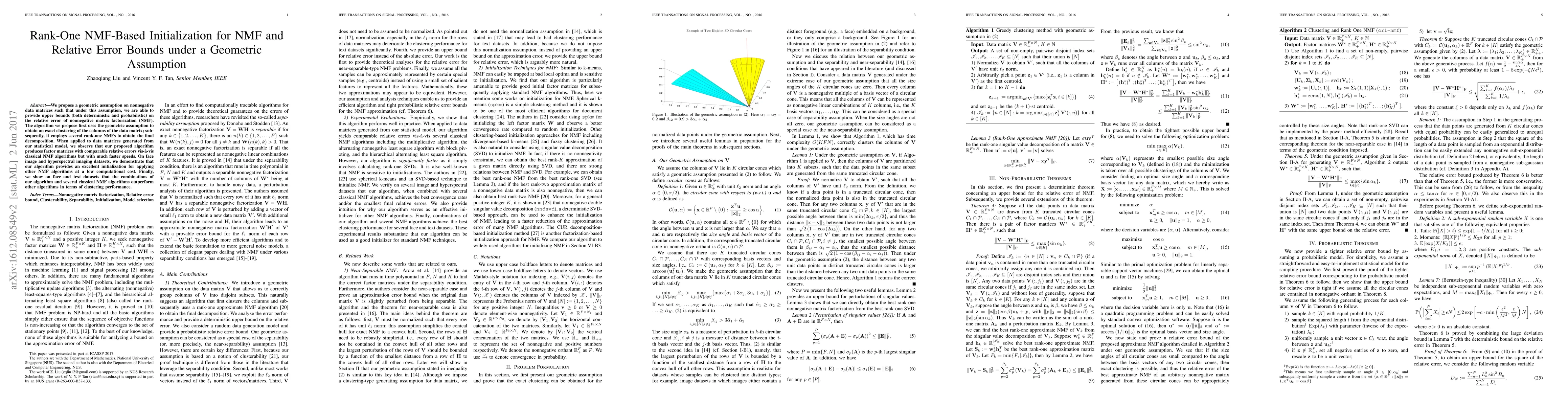We propose a geometric assumption on nonnegative data matrices such that under this assumption, we are able to provide upper bounds (both deterministic and probabilistic) on the relative error of nonnegative matrix factorization (NMF). The algorithm we propose first uses the geometric assumption to obtain an exact clustering of the columns of the data matrix; subsequently, it employs several rank-one NMFs to obtain the final decomposition. When applied to data matrices generated from our statistical model, we observe that our proposed algorithm produces factor matrices with comparable relative errors vis-\`a-vis classical NMF algorithms but with much faster speeds. On face image and hyperspectral imaging datasets, we demonstrate that our algorithm provides an excellent initialization for applying other NMF algorithms at a low computational cost. Finally, we show on face and text datasets that the combinations of our algorithm and several classical NMF algorithms outperform other algorithms in terms of clustering performance.