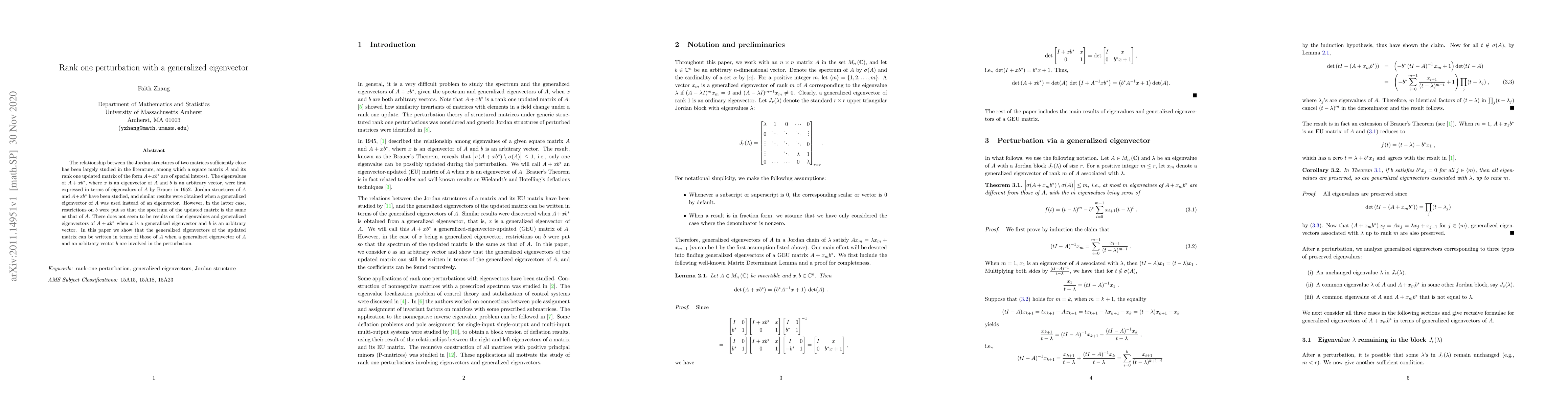 This paper investigates the relationship between the Jordan structures of two matrices when a generalized eigenvector is used in a rank one perturbation, showing that the generalized eigenvectors can be expressed in terms of those of the original matrix.