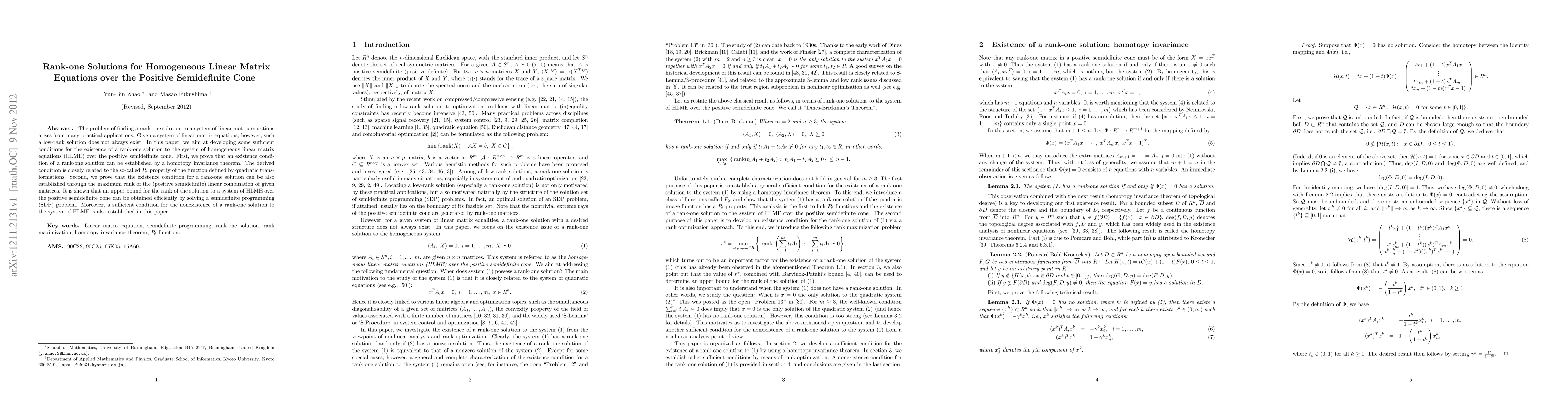 This paper explores sufficient conditions for the existence of rank-one solutions to homogeneous linear matrix equations over the positive semidefinite cone, using homotopy invariance and the $P_\emptyset$ property. It also establishes an upper bound for the rank of solutions via semidefinite programming and provides a condition for the nonexistence of such solutions.