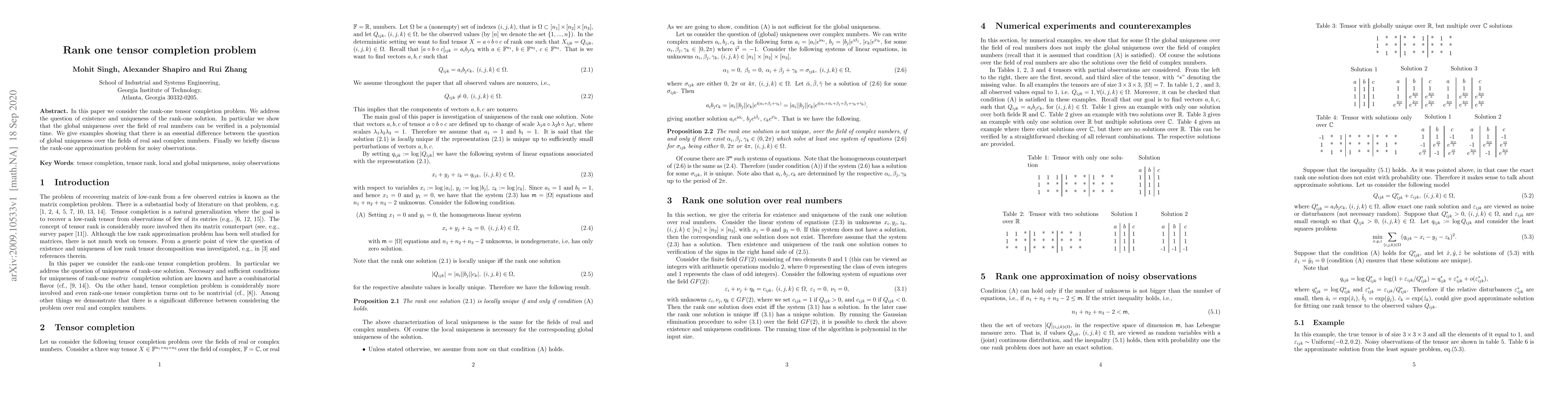 This paper investigates the rank-one tensor completion problem, demonstrating polynomial-time global uniqueness verification over real numbers while highlighting differences with complex numbers. It also touches on the rank-one approximation issue for noisy data.