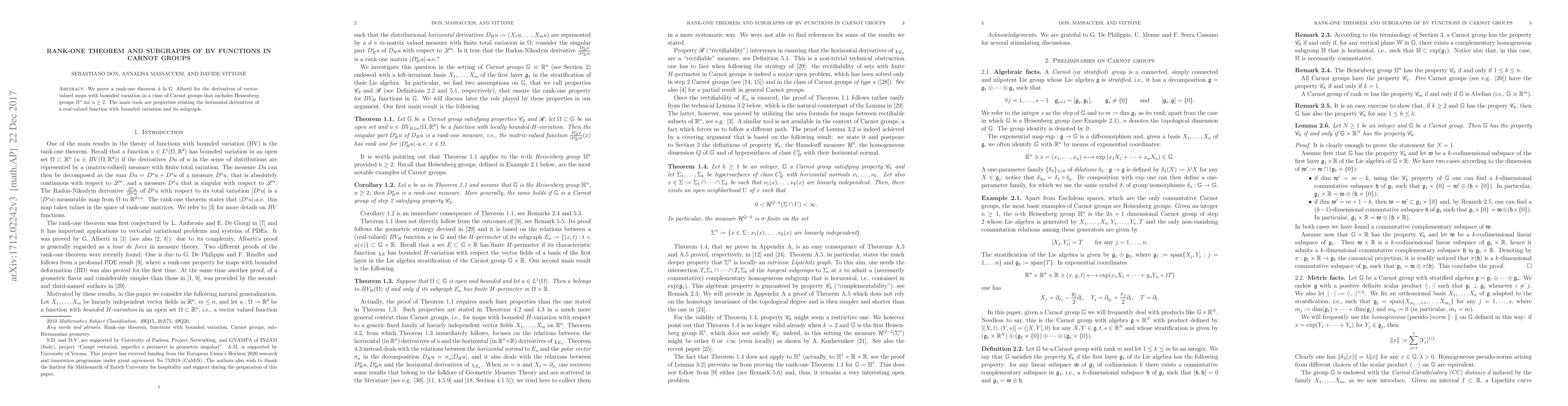 We prove a rank-one theorem \`a la G. Alberti for the derivatives of vector-valued maps with bounded variation in a class of Carnot groups that includes Heisenberg groups $\mathbb H^n$ for $n\geq 2$. The main tools are properties relating the horizontal derivatives of a real-valued function with bounded variation and its subgraph.