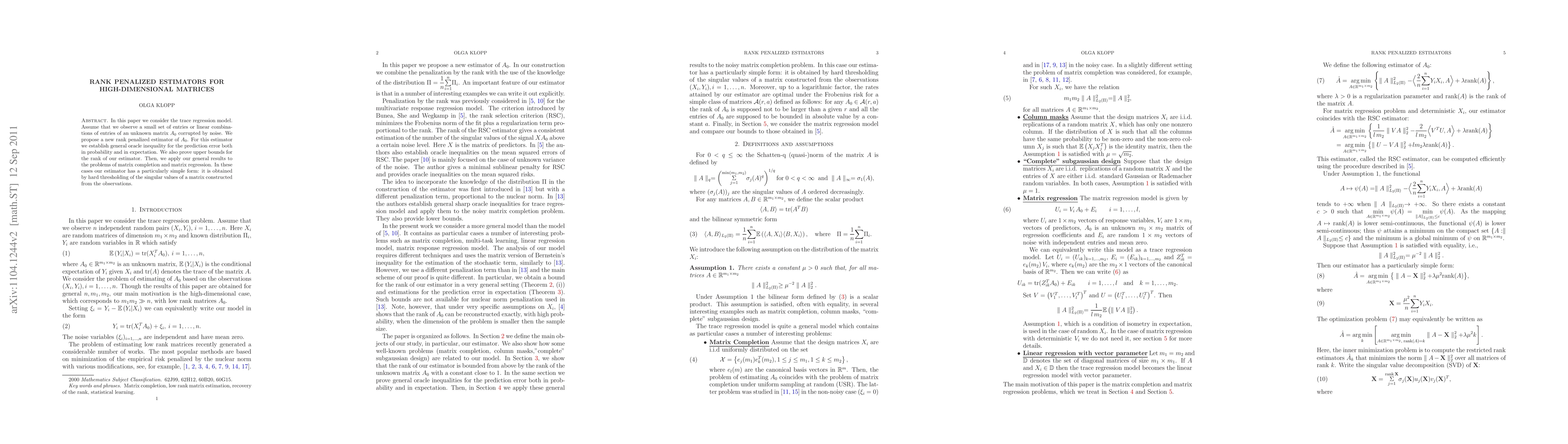 In this paper we consider the trace regression model. Assume that we observe a small set of entries or linear combinations of entries of an unknown matrix $A_0$ corrupted by noise. We propose a new rank penalized estimator of $A_0$. For this estimator we establish general oracle inequality for the prediction error both in probability and in expectation. We also prove upper bounds for the rank of our estimator. Then, we apply our general results to the problems of matrix completion and matrix regression. In these cases our estimator has a particularly simple form: it is obtained by hard thresholding of the singular values of a matrix constructed from the observations.