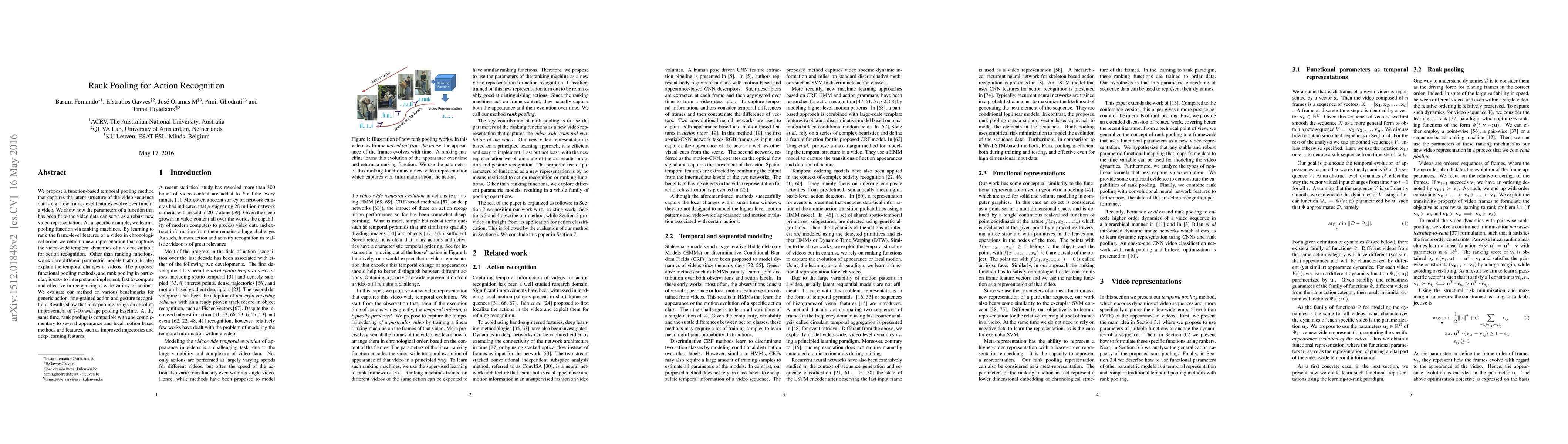The paper proposes rank pooling, a temporal function-based pooling method that captures video-wide temporal dynamics by learning to rank frame-level features, enhancing action recognition performance. Rank pooling shows an average improvement of 7-10% over baseline methods and is compatible with other feature extraction techniques.