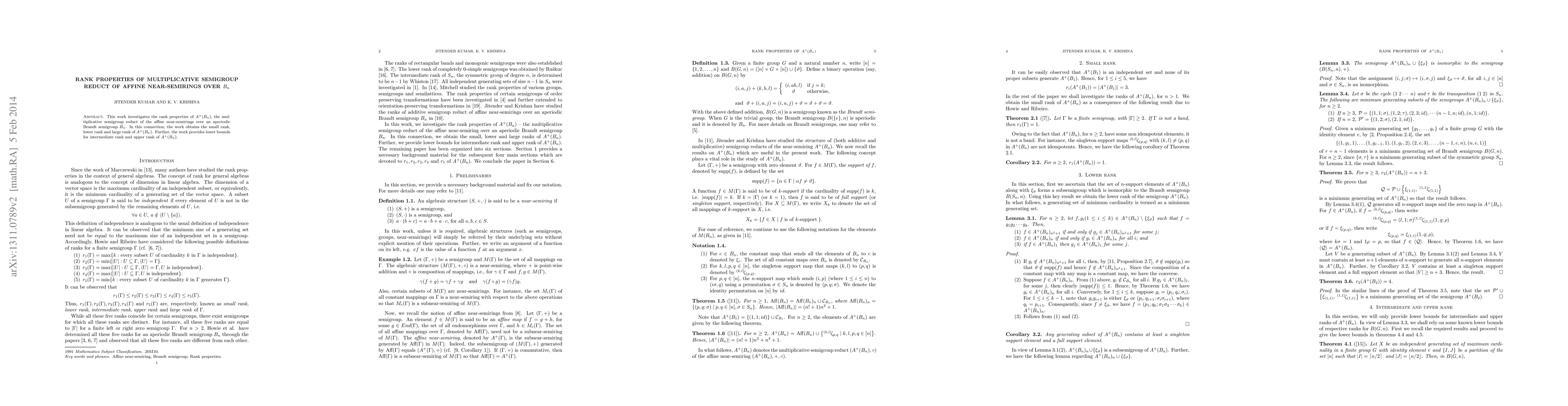 This paper explores the rank properties of $A^+(B_n)$, the multiplicative semigroup reduct of affine near-semirings over an aperiodic Brandt semigroup $B_n$, determining its small, lower, and large ranks, and providing bounds for intermediate and upper ranks.