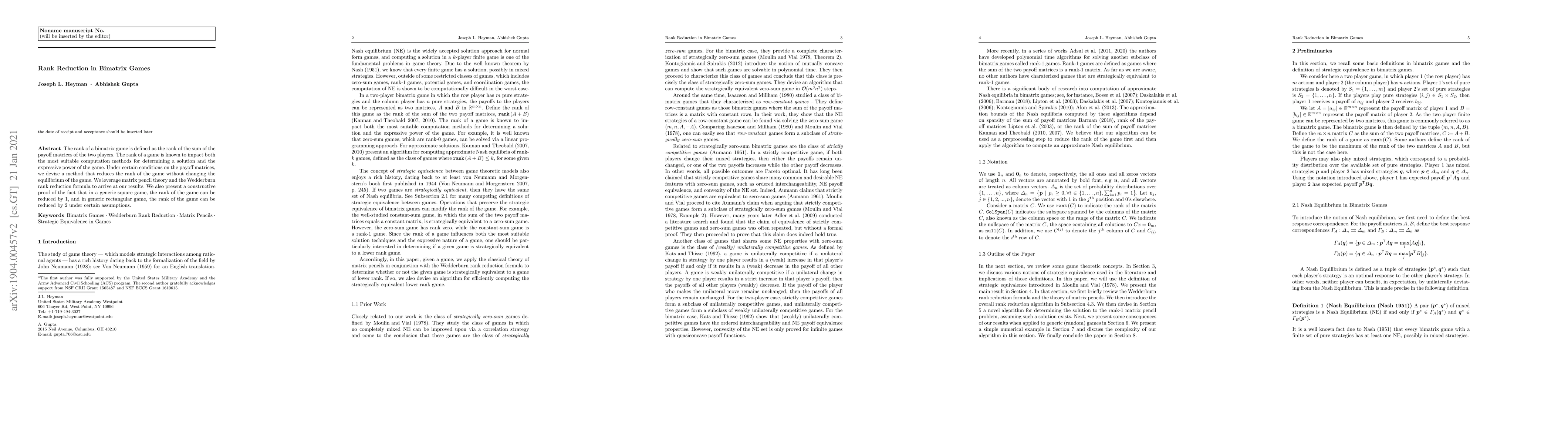 The rank of a bimatrix game is defined as the rank of the sum of the payoff matrices of the two players. The rank of a game is known to impact both the most suitable computation methods for determining a solution and the expressive power of the game. Under certain conditions on the payoff matrices, we devise a method that reduces the rank of the game without changing the equilibrium of the game. We leverage matrix pencil theory and the Wedderburn rank reduction formula to arrive at our results. We also present a constructive proof of the fact that in a generic square game, the rank of the game can be reduced by 1, and in generic rectangular game, the rank of the game can be reduced by 2 under certain assumptions.