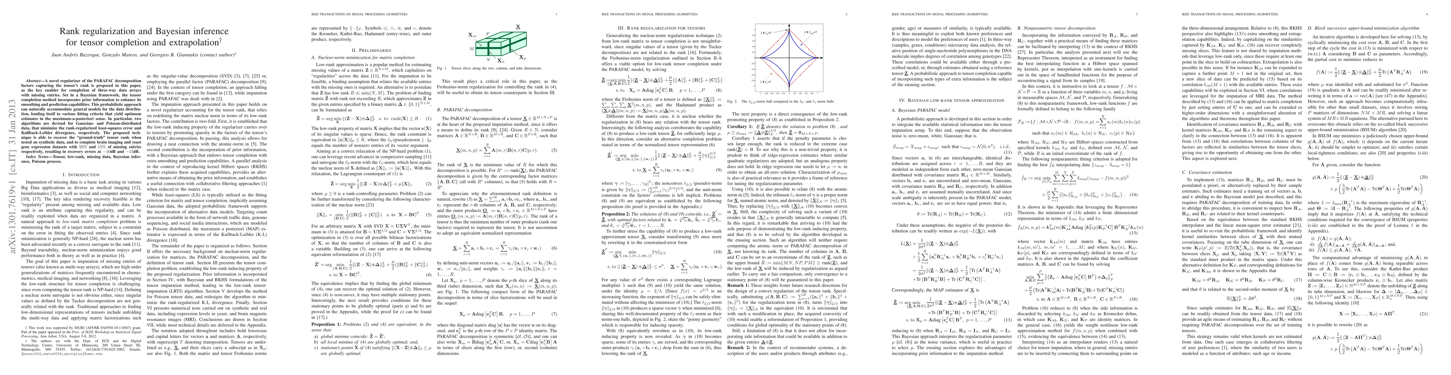 A novel regularizer of the PARAFAC decomposition factors capturing the tensor's rank is proposed in this paper, as the key enabler for completion of three-way data arrays with missing entries. Set in a Bayesian framework, the tensor completion method incorporates prior information to enhance its smoothing and prediction capabilities. This probabilistic approach can naturally accommodate general models for the data distribution, lending itself to various fitting criteria that yield optimum estimates in the maximum-a-posteriori sense. In particular, two algorithms are devised for Gaussian- and Poisson-distributed data, that minimize the rank-regularized least-squares error and Kullback-Leibler divergence, respectively. The proposed technique is able to recover the "ground-truth'' tensor rank when tested on synthetic data, and to complete brain imaging and yeast gene expression datasets with 50% and 15% of missing entries respectively, resulting in recovery errors at -10dB and -15dB.