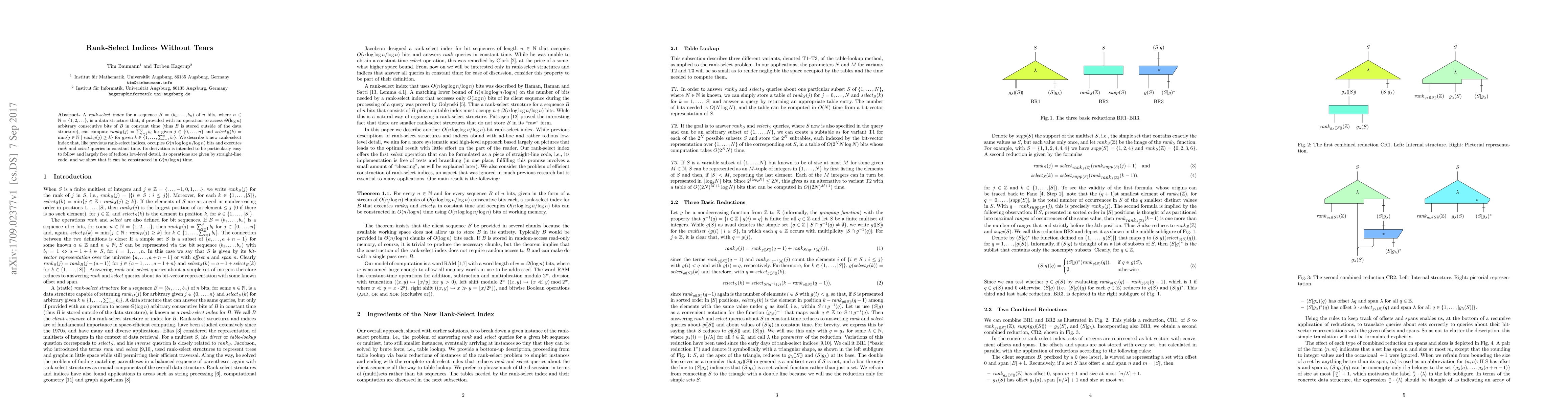 A rank-select index for a sequence $B=(b_1,\ldots,b_n)$ of $n$ bits is a data structure that, if provided with an operation to access $\Theta(\log n)$ arbitrary consecutive bits of $B$ in constant time (thus $B$ is stored outside of the data structure), can compute $\mathit{rank}_B(j)=\sum_{i=1}^j b_i$ for given $j\in\{0,\ldots,n\}$ and $\mathit{select}_B(k)=\min\{j:\mathit{rank}_B(j)\ge k\}$ for given $k\in\{1,\ldots,\sum_{i=1}^n b_i\}$. We describe a new rank-select index that, like previous rank-select indices, occupies $O(n\log\log n/\log n)$ bits and executes $\mathit{rank}$ and $\mathit{select}$ queries in constant time. Its derivation is intended to be particularly easy to follow and largely free of tedious low-level detail, its operations are given by straight-line code, and we show that it can be constructed in $O(n/\log n)$ time.