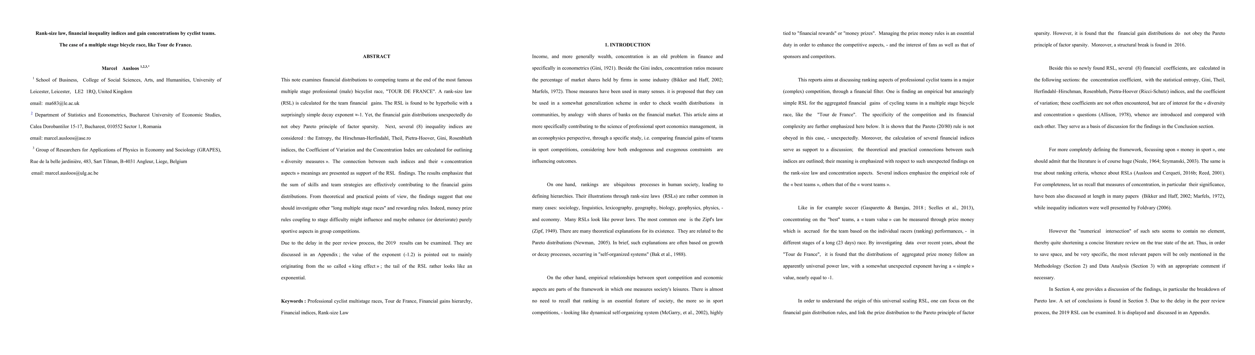 This note examines financial distributions to competing teams at the end of the most famous multiple stage professional (male) bicyclist race, TOUR DE FRANCE. A rank-size law (RSL) is calculated for the team financial gains. The RSL is found to be hyperbolic with a surprisingly simple decay exponent (about equal to -1). Yet, the financial gain distributions unexpectedly do not obey Pareto principle of factor sparsity. Next, several (8) inequality indices are considered : the Entropy, the Hirschman-Herfindahl, Theil, Pietra-Hoover, Gini, Rosenbluth indices, the Coefficient of Variation and the Concentration Index are calculated for outlining diversity measures. The connection between such indices and their concentration aspects meanings are presented as support of the RSL findings. The results emphasize that the sum of skills and team strategies are effectively contributing to the financial gains distributions. From theoretical and practical points of view, the findings suggest that one should investigate other "long multiple stage races" and rewarding rules. Indeed, money prize rules coupling to stage difficulty might influence and maybe enhance (or deteriorate) purely sportive aspects in group competitions. Due to the delay in the peer review process, the 2019 results can be examined. They are discussed in an Appendix; the value of the exponent (-1.2) is pointed out to mainly originating from the so called "king effect"; the tail of the RSL rather looks like an exponential.