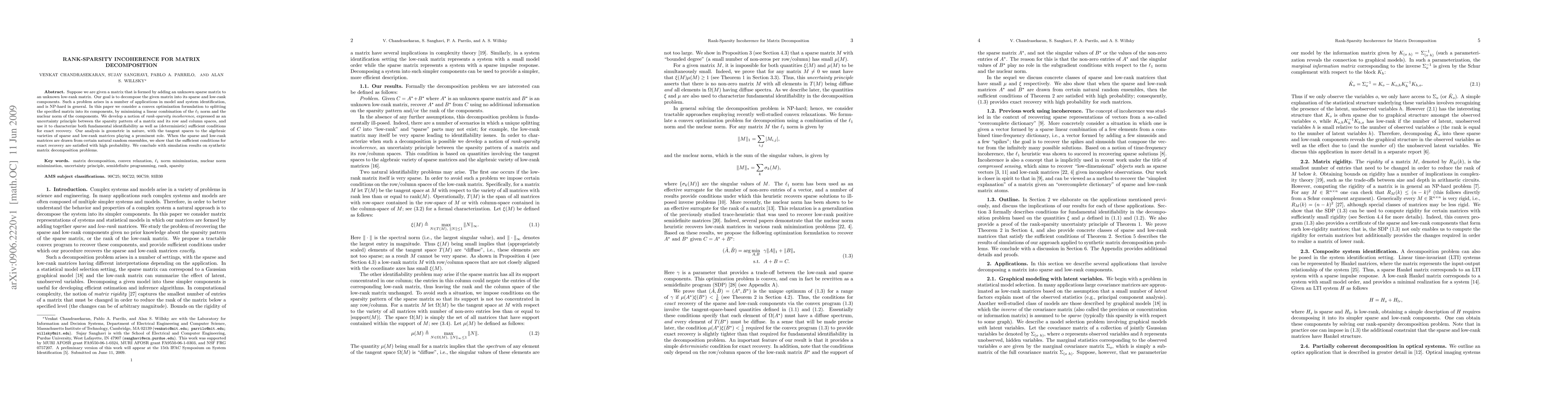 This paper proposes a convex optimization approach to decompose a matrix formed by adding a sparse matrix to a low-rank matrix, using a linear combination of $\ell_1$ and nuclear norms. It introduces the concept of rank-sparsity incoherence to characterize identifiability and sufficient conditions for exact recovery, showing high probability of success under certain random matrix ensembles.