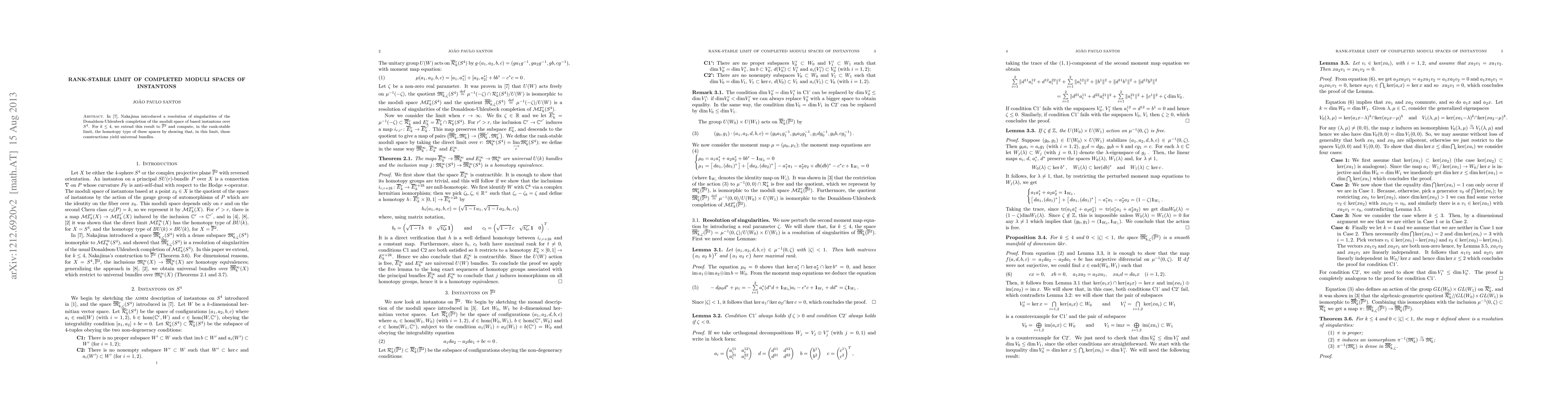 Nakajima introduced a resolution of singularities of the Donaldson-Uhlenbeck completion of the moduli space of based instantons over $S^4$. For $k\leq 4$, we extend this result to $\mathbb P^2$ and compute, in the rank-stable limit, the homotopy type of these spaces by showing that, in this limit, these constructions yield universal bundles.