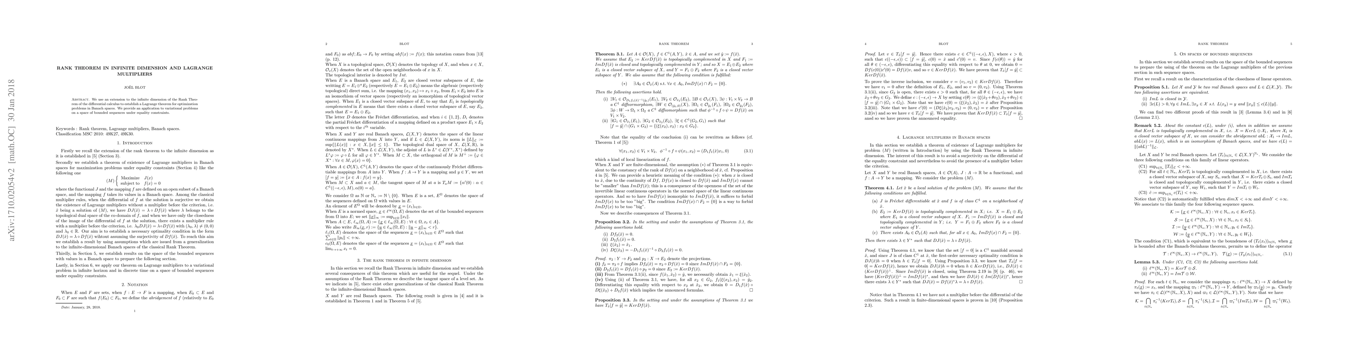 We use an extension to the infinite dimension of the rank theorem of the differential calculus to establish a Karush-Huhn-Tucker theorem for optimization problems in Banach spaces. We provide an application to variational problems on bounded processus under equality constraints.