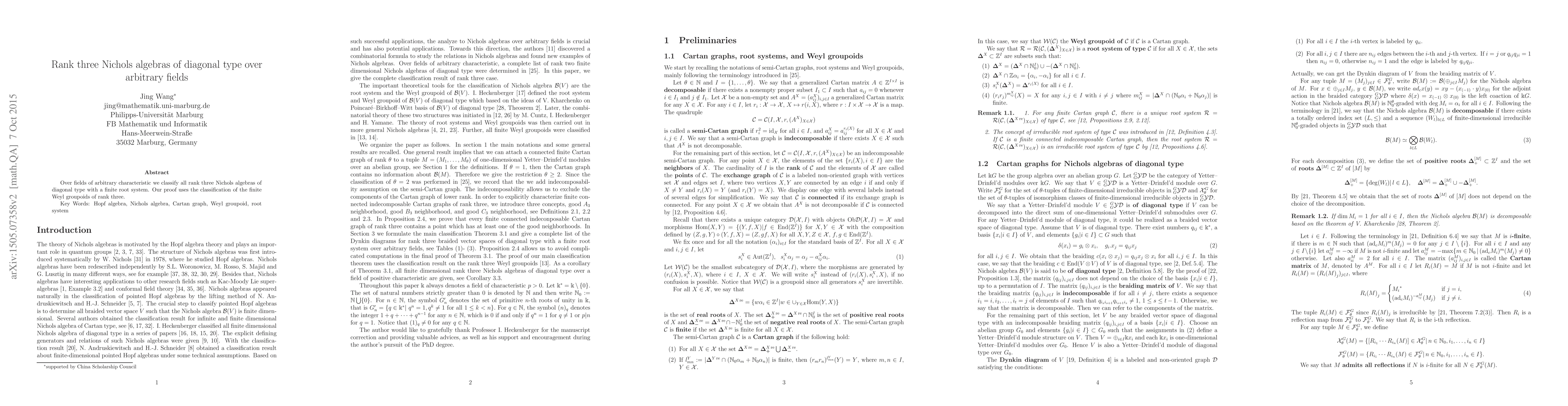 Summary: This paper classifies all rank three diagonal Nichols algebras over fields of any characteristic, utilizing the classification of finite Weyl groupoids of rank three to achieve its results. The focus is on the structure and properties of these algebras within the context of positive characteristic fields.