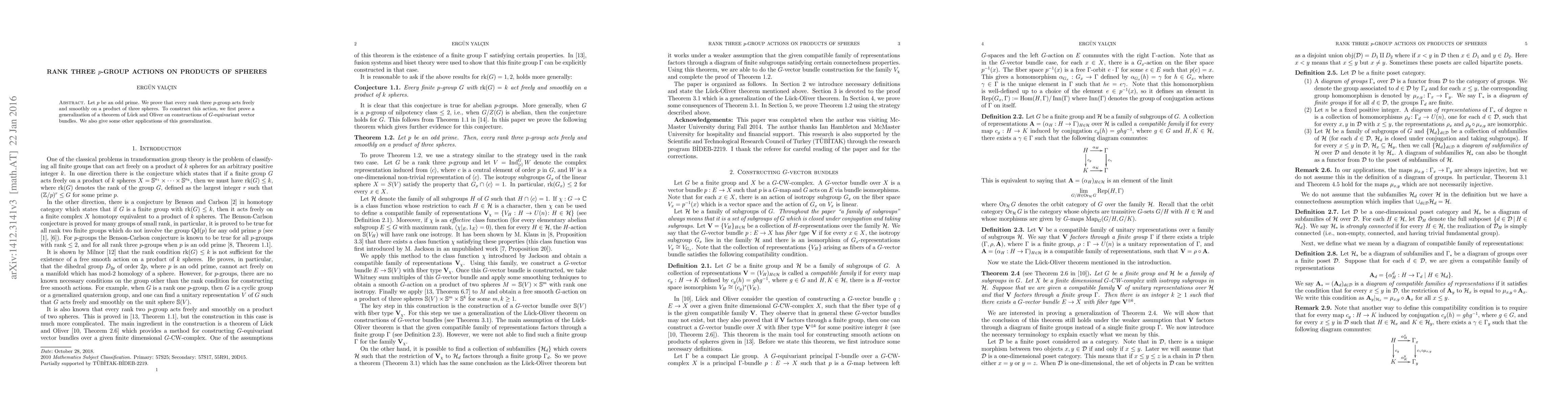 Let p be an odd prime. We prove that every rank three p-group acts freely and smoothly on a product of three spheres. To construct this action, we first prove a generalization of a theorem of L\" uck and Oliver on constructions of G-equivariant vector bundles. We also give some other applications of this generalization.