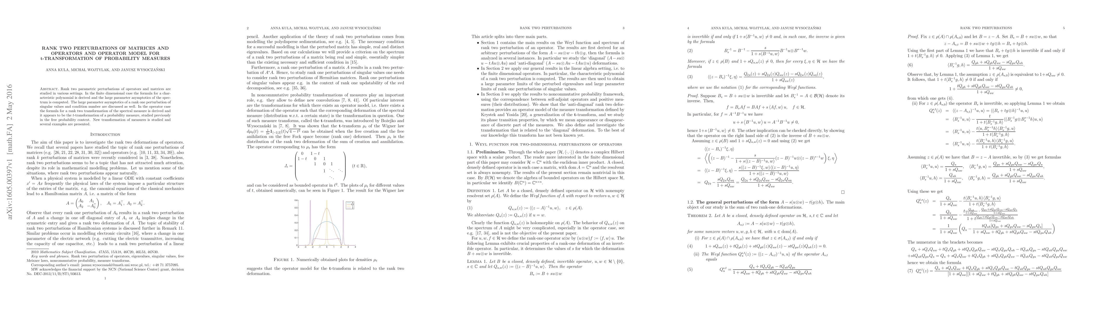 This paper studies rank two perturbations of matrices and operators, deriving formulas for characteristic polynomials and transforming spectral measures, with implications for probability theory and free probability contexts.