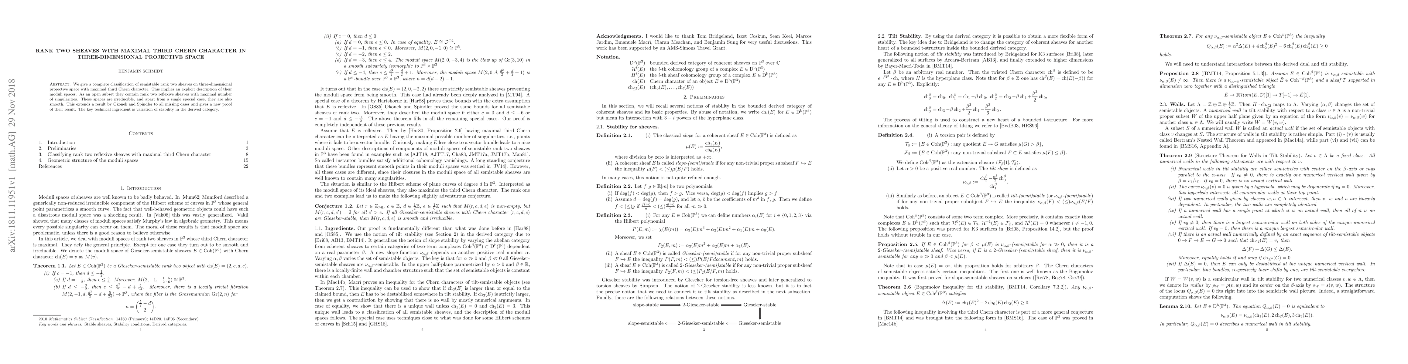 The paper classifies semistable rank two sheaves in three-dimensional projective space with the maximal third Chern character, providing an explicit description of their moduli spaces, which are mostly smooth except for one special case. The key method used is variation of stability in the derived category.