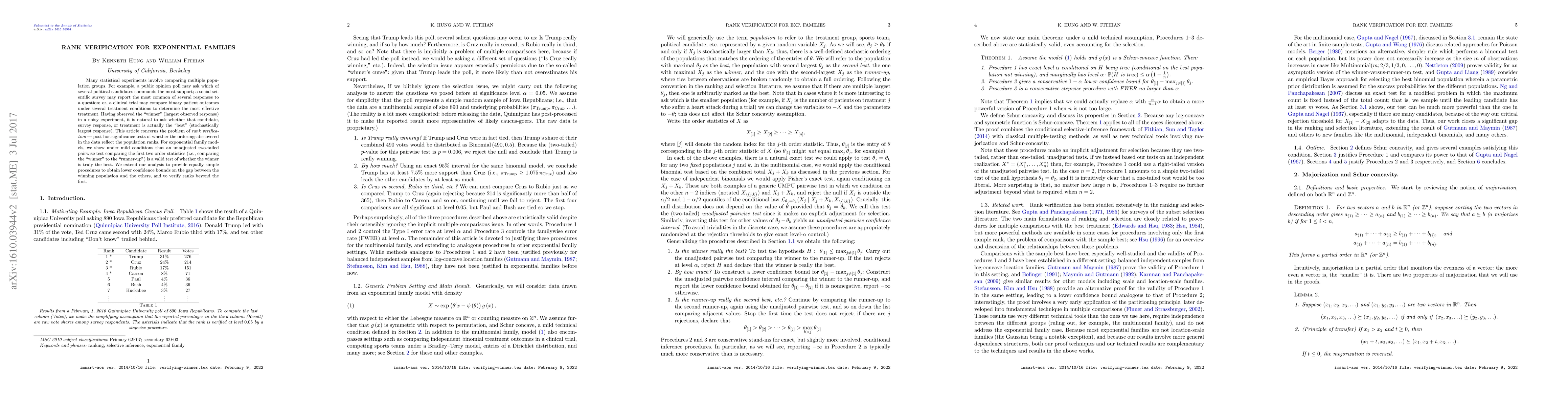 Many statistical experiments involve comparing multiple population groups. For example, a public opinion poll may ask which of several political candidates commands the most support; a social scientific survey may report the most common of several responses to a question; or, a clinical trial may compare binary patient outcomes under several treatment conditions to determine the most effective treatment. Having observed the "winner" (largest observed response) in a noisy experiment, it is natural to ask whether that candidate, survey response, or treatment is actually the "best" (stochastically largest response). This article concerns the problem of rank verification --- post hoc significance tests of whether the orderings discovered in the data reflect the population ranks. For exponential family models, we show under mild conditions that an unadjusted two-tailed pairwise test comparing the top two observations (i.e., comparing the "winner" to the "runner-up") is a valid test of whether the winner is truly the best. We extend our analysis to provide equally simple procedures to obtain lower confidence bounds on the gap between the winning population and the others, and to verify ranks beyond the first.