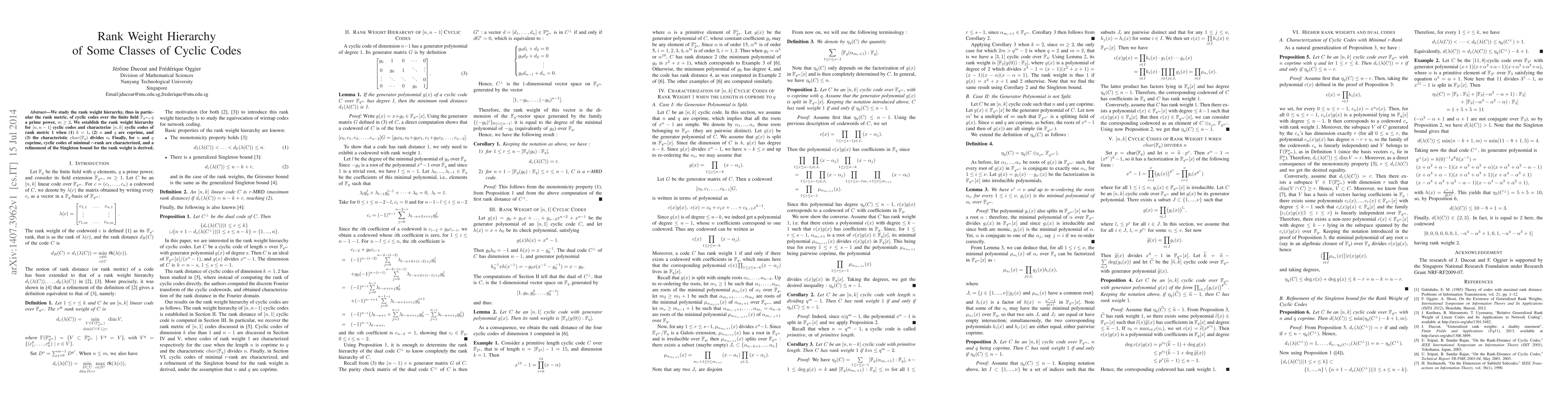 We study the rank weight hierarchy, thus in particular the rank metric, of cyclic codes over the finite field $\mathbb F_{q^m}$, $q$ a prime power, $m \geq 2$. We establish the rank weight hierarchy for $[n,n-1]$ cyclic codes and characterize $[n,k]$ cyclic codes of rank metric 1 when (1) $k=1$, (2) $n$ and $q$ are coprime, and (3) the characteristic $char(\mathbb F_q)$ divides $n$. Finally, for $n$ and $q$ coprime, cyclic codes of minimal $r$-rank are characterized, and a refinement of the Singleton bound for the rank weight is derived.