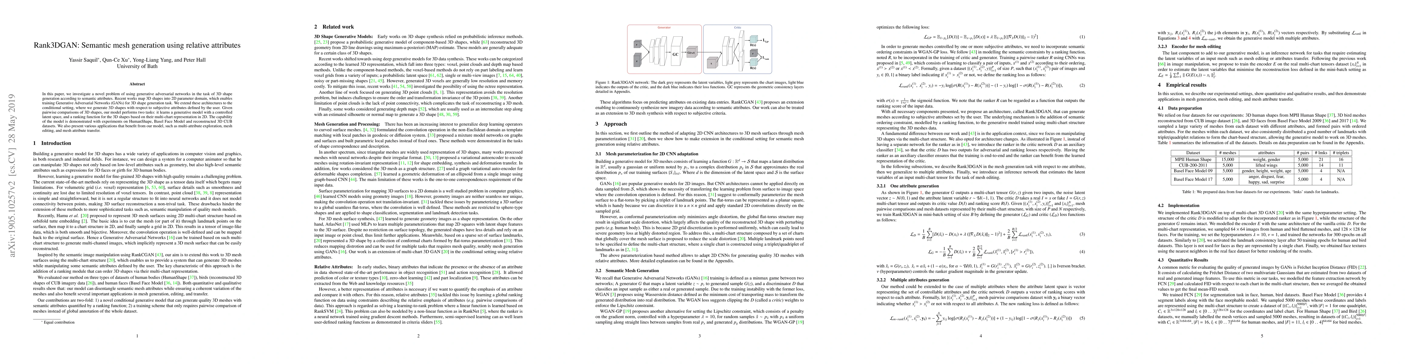 In this paper, we investigate a novel problem of using generative adversarial networks in the task of 3D shape generation according to semantic attributes. Recent works map 3D shapes into 2D parameter domain, which enables training Generative Adversarial Networks (GANs) for 3D shape generation task. We extend these architectures to the conditional setting, where we generate 3D shapes with respect to subjective attributes defined by the user. Given pairwise comparisons of 3D shapes, our model performs two tasks: it learns a generative model with a controlled latent space, and a ranking function for the 3D shapes based on their multi-chart representation in 2D. The capability of the model is demonstrated with experiments on HumanShape, Basel Face Model and reconstructed 3D CUB datasets. We also present various applications that benefit from our model, such as multi-attribute exploration, mesh editing, and mesh attribute transfer.