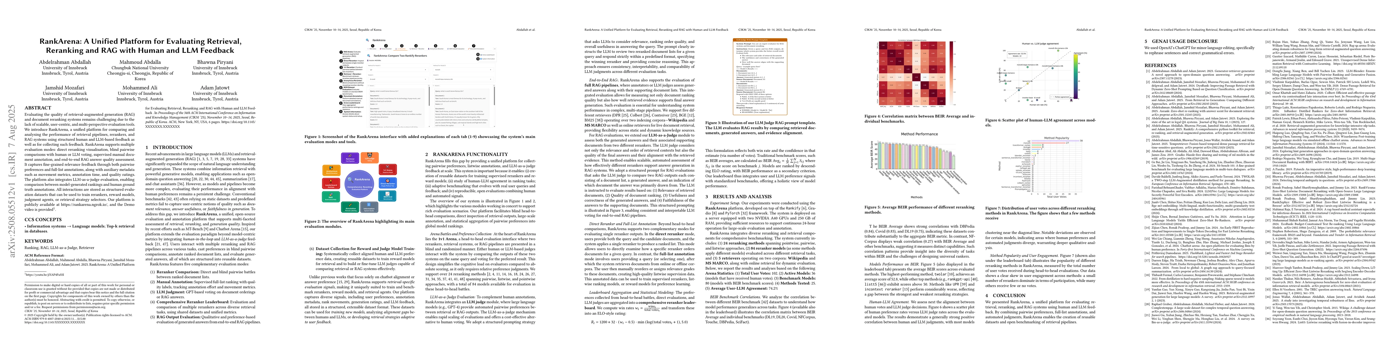 Evaluating the quality of retrieval-augmented generation (RAG) and document reranking systems remains challenging due to the lack of scalable, user-centric, and multi-perspective evaluation tools. We introduce RankArena, a unified platform for comparing and analysing the performance of retrieval pipelines, rerankers, and RAG systems using structured human and LLM-based feedback as well as for collecting such feedback. RankArena supports multiple evaluation modes: direct reranking visualisation, blind pairwise comparisons with human or LLM voting, supervised manual document annotation, and end-to-end RAG answer quality assessment. It captures fine-grained relevance feedback through both pairwise preferences and full-list annotations, along with auxiliary metadata such as movement metrics, annotation time, and quality ratings. The platform also integrates LLM-as-a-judge evaluation, enabling comparison between model-generated rankings and human ground truth annotations. All interactions are stored as structured evaluation datasets that can be used to train rerankers, reward models, judgment agents, or retrieval strategy selectors. Our platform is publicly available at https://rankarena.ngrok.io/, and the Demo video is provided https://youtu.be/jIYAP4PaSSI.