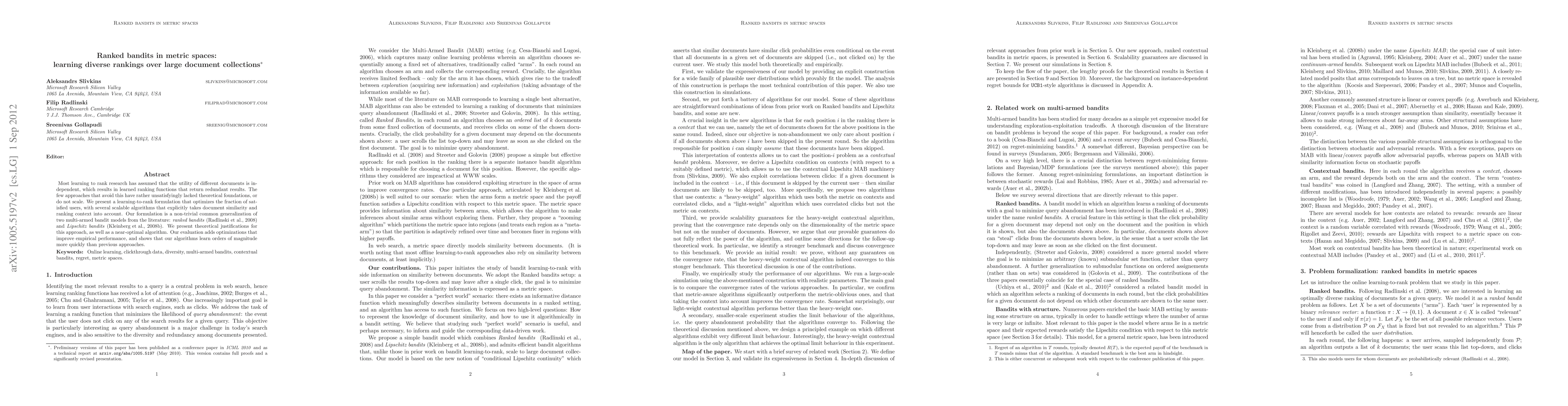 Most learning to rank research has assumed that the utility of different documents is independent, which results in learned ranking functions that return redundant results. The few approaches that avoid this have rather unsatisfyingly lacked theoretical foundations, or do not scale. We present a learning-to-rank formulation that optimizes the fraction of satisfied users, with several scalable algorithms that explicitly takes document similarity and ranking context into account. Our formulation is a non-trivial common generalization of two multi-armed bandit models from the literature: "ranked bandits" (Radlinski et al., ICML 2008) and "Lipschitz bandits" (Kleinberg et al., STOC 2008). We present theoretical justifications for this approach, as well as a near-optimal algorithm. Our evaluation adds optimizations that improve empirical performance, and shows that our algorithms learn orders of magnitude more quickly than previous approaches.