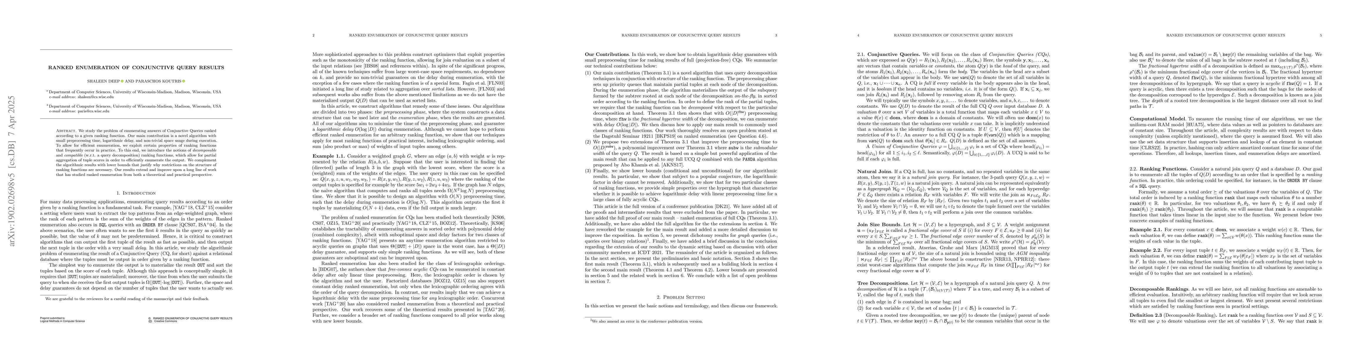 This paper proposes a novel priority queue-based algorithm for efficiently enumerating top-k answers to conjunctive queries in relational databases, leveraging decomposable and compatible ranking functions and query decomposition to achieve near-optimal delay and space efficiency. The study also provides lower bounds and discusses the necessity of certain ranking function properties.