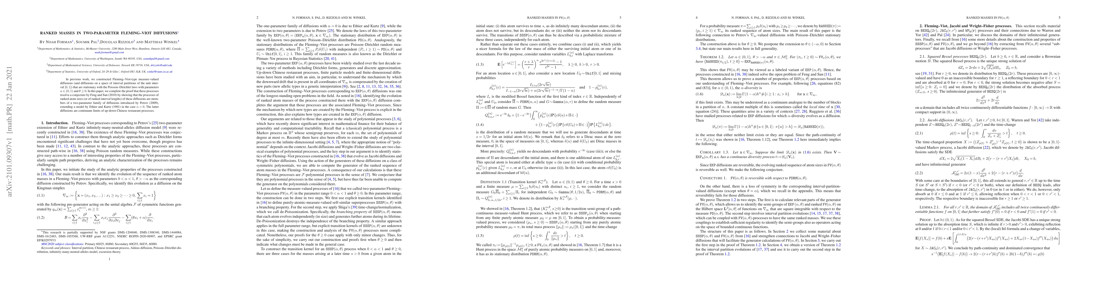 This paper proves that the ranked masses in two-parameter Fleming-Viot diffusions correspond to a two-parameter family of diffusions, resolving a conjecture by Feng and Sun. It extends the model by Ethier and Kurtz to non-zero $\alpha$, establishing these processes as continuum limits of up-down Chinese restaurant processes.