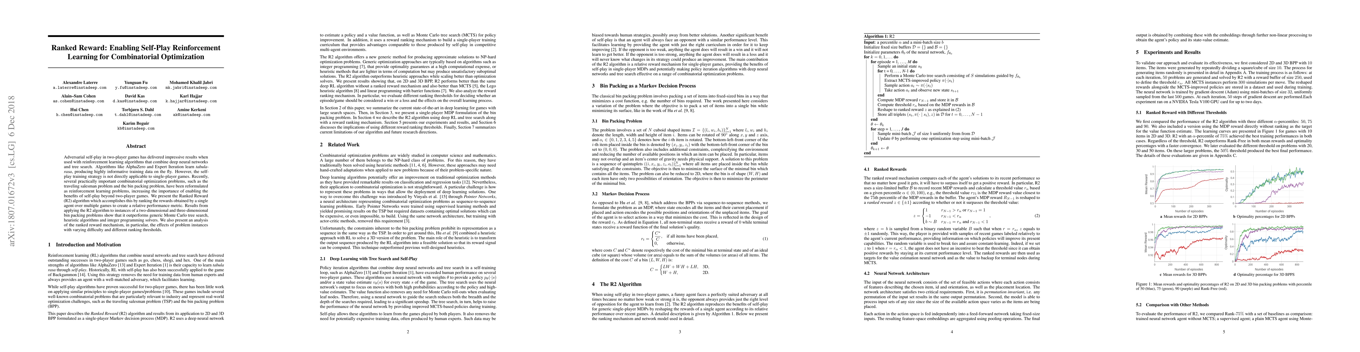 The Ranked Reward (R2) algorithm enables self-play reinforcement learning for combinatorial optimization by ranking rewards from multiple games to create a relative performance metric. Applied to bin packing problems, R2 outperforms Monte Carlo tree search, heuristic algorithms, and integer programming solvers, demonstrating the potential of self-play in single-player reinforcement learning tasks.