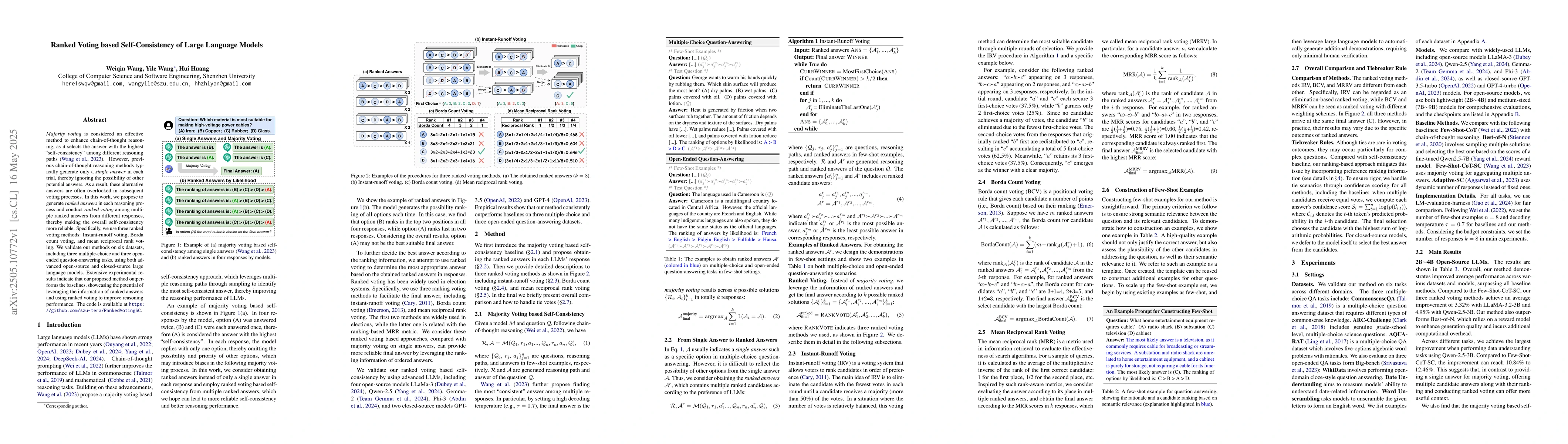 The research proposes generating ranked answers in each reasoning process using three ranked voting methods: Instant-runoff voting, Borda count voting, and mean reciprocal rank voting. These methods are validated on six datasets, including multiple-choice and open-ended question-answering tasks, with both open-source and closed-source large language models.