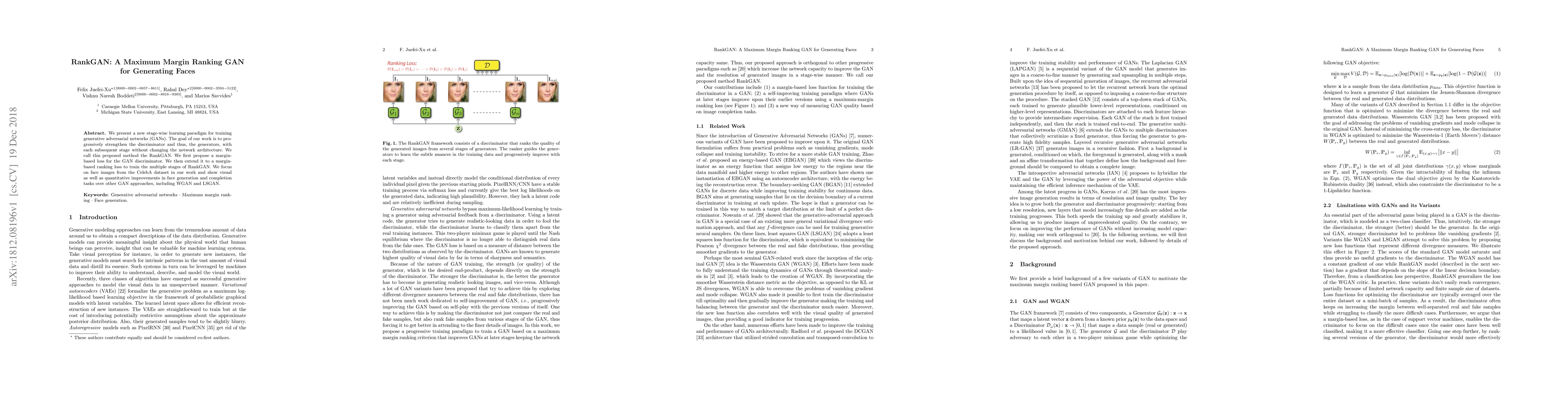 We present a new stage-wise learning paradigm for training generative adversarial networks (GANs). The goal of our work is to progressively strengthen the discriminator and thus, the generators, with each subsequent stage without changing the network architecture. We call this proposed method the RankGAN. We first propose a margin-based loss for the GAN discriminator. We then extend it to a margin-based ranking loss to train the multiple stages of RankGAN. We focus on face images from the CelebA dataset in our work and show visual as well as quantitative improvements in face generation and completion tasks over other GAN approaches, including WGAN and LSGAN.
