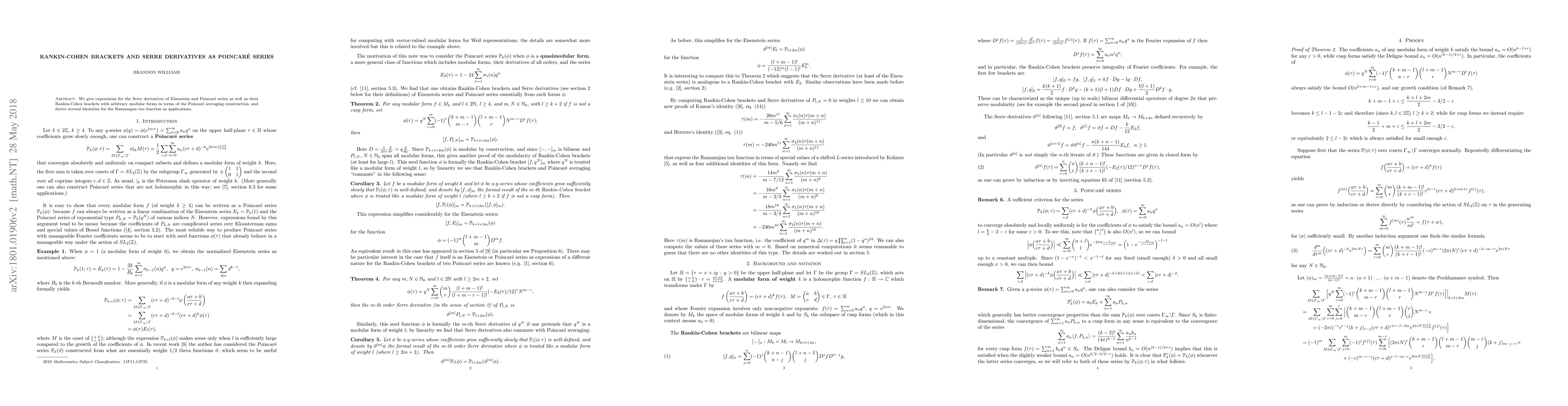 This paper provides expressions for the Serre derivatives and Rankin-Cohen brackets of Eisenstein and Poincaré series using the Poincaré averaging construction, and derives several identities for the Ramanujan tau function as applications.
