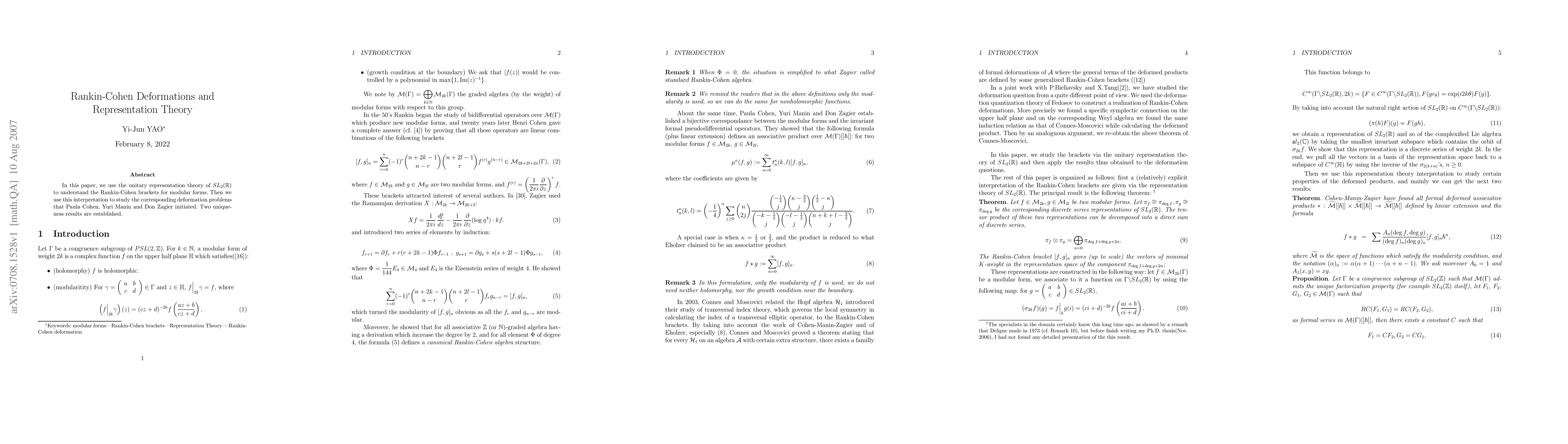 In this paper, we use the unitary representation theory of $SL_2(\mathbb R)$ to understand the Rankin-Cohen brackets for modular forms. Then we use this interpretation to study the corresponding deformation problems that Paula Cohen, Yuri Manin and Don Zagier initiated. Two uniqueness results are established.