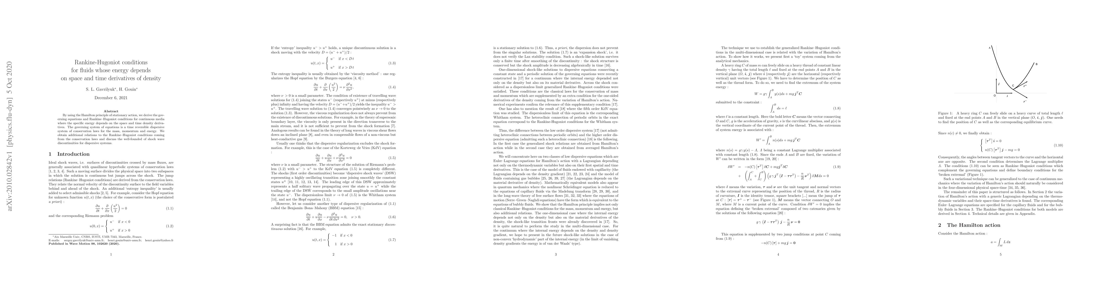 This paper derives the Rankine-Hugoniot conditions for fluids where energy depends on the spatial and temporal derivatives of density, using the Hamilton principle. It establishes a time-reversible dispersive system of conservation laws and discusses the validity of shock wave discontinuities in such systems.