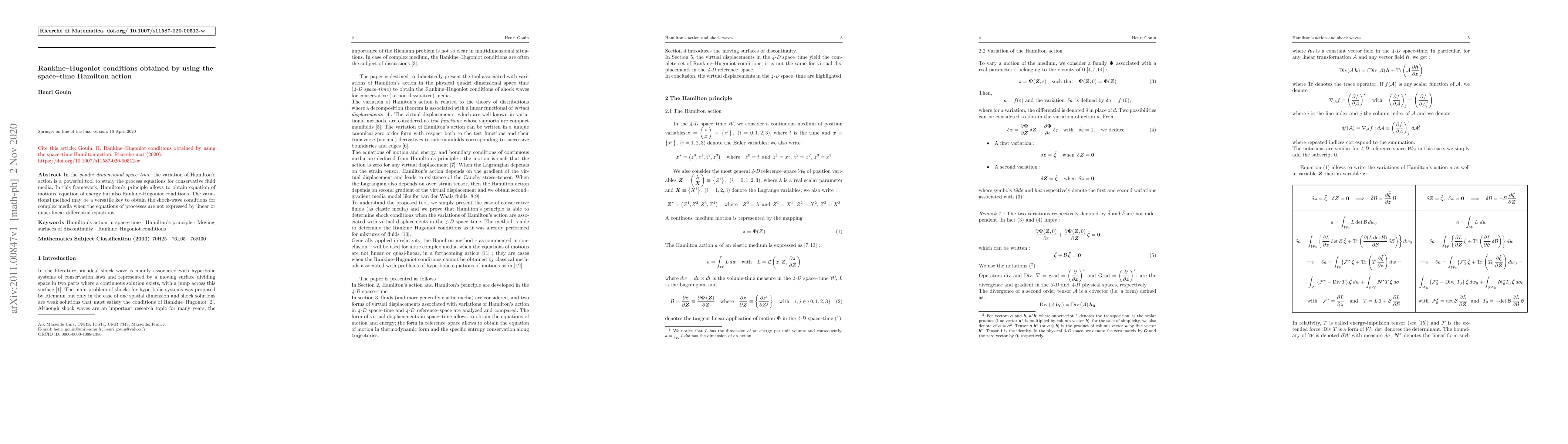 In the quadri-dimensional space-time, the variation of Hamilton's action is a powerful tool to study the process equations for conservative fluid media. In this framework, Hamilton's principle allows to obtain equation of motions, equation of energy but also Rankine-Hugoniot conditions. The varia-tional method may be a versatile key to obtain the shock-wave conditions for complex media when the equations of processes are not expressed by linear or quasi-linear differential equations.