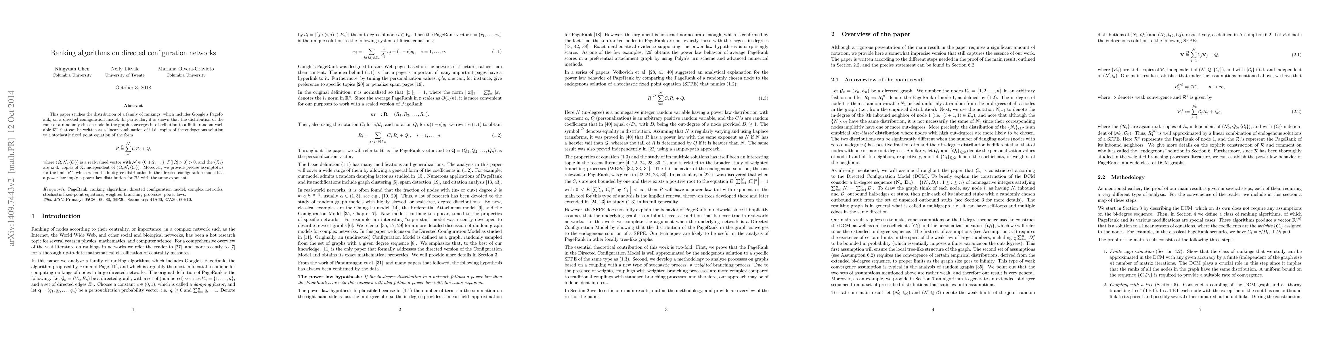 This paper studies the distribution of a family of rankings, which includes Google's PageRank, on a directed configuration model. In particular, it is shown that the distribution of the rank of a randomly chosen node in the graph converges in distribution to a finite random variable $\mathcal{R}^*$ that can be written as a linear combination of i.i.d. copies of the endogenous solution to a stochastic fixed point equation of the form $$\mathcal{R} \stackrel{\mathcal{D}}{=} \sum_{i=1}^{\mathcal{N}} \mathcal{C}_i \mathcal{R}_i + \mathcal{Q},$$ where $(\mathcal{Q}, \mathcal{N}, \{ \mathcal{C}_i\})$ is a real-valued vector with $\mathcal{N} \in \{0,1,2,\dots\}$, $P(|\mathcal{Q}| > 0) > 0$, and the $\{\mathcal{R}_i\}$ are i.i.d. copies of $\mathcal{R}$, independent of $(\mathcal{Q}, \mathcal{N}, \{ \mathcal{C}_i\})$. Moreover, we provide precise asymptotics for the limit $\mathcal{R}^*$, which when the in-degree distribution in the directed configuration model has a power law imply a power law distribution for $\mathcal{R}^*$ with the same exponent.
