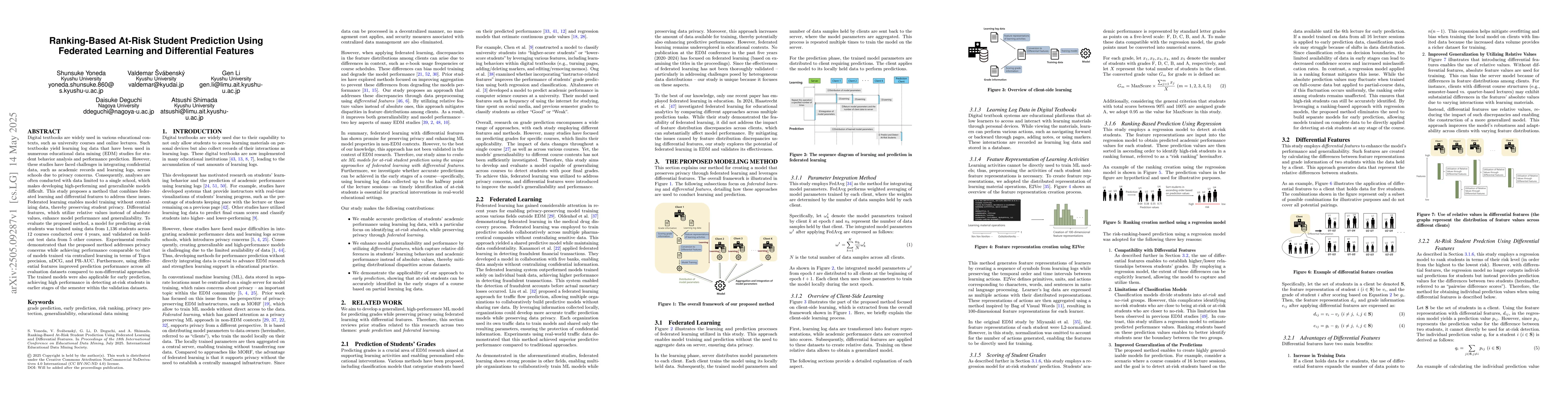 This work differs from existing research by successfully combining federated learning with differential features to address privacy concerns in educational data mining, enabling high-performing at-risk student prediction models across multiple schools.
