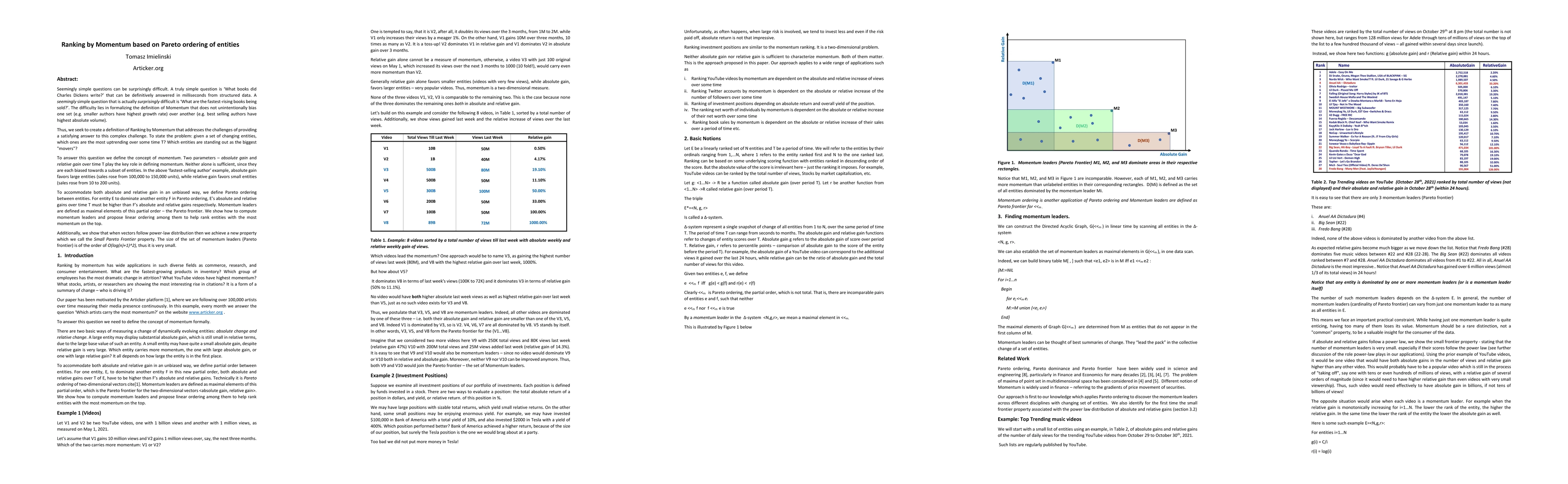 This research paper proposes a method to rank entities based on their momentum, which is defined as the Pareto ordering of absolute and relative gains over time. It shows that the number of momentum leaders is very small, even when vectors follow power-law distributions.