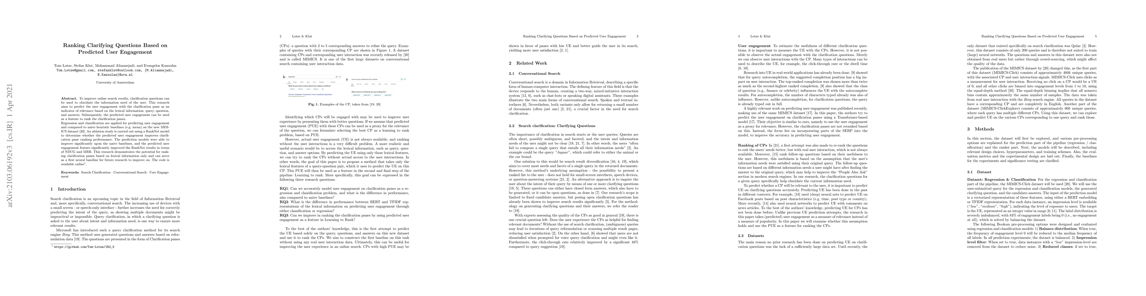 Researchers developed a model to predict user engagement with clarification panes based on query, question, and answers, improving ranking performance over naive baselines.