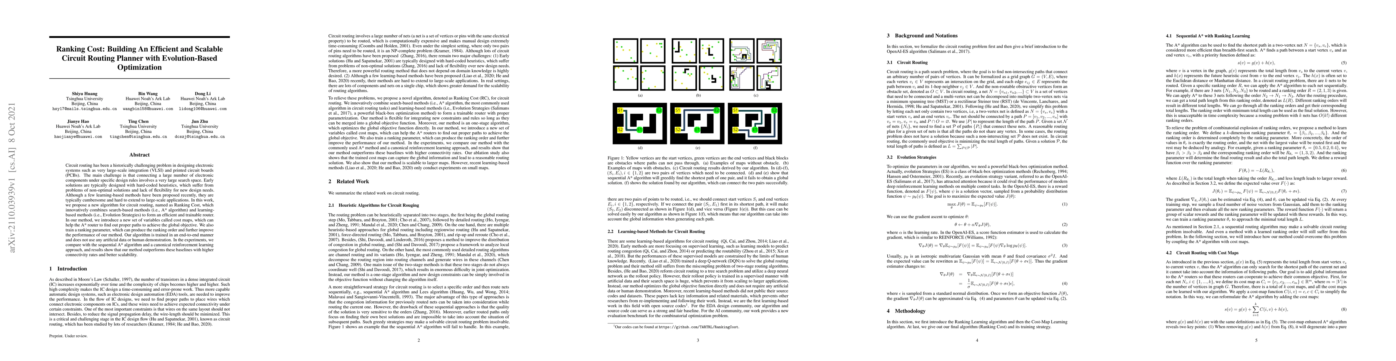 Circuit routing has been a historically challenging problem in designing electronic systems such as very large-scale integration (VLSI) and printed circuit boards (PCBs). The main challenge is that connecting a large number of electronic components under specific design rules involves a very large search space. Early solutions are typically designed with hard-coded heuristics, which suffer from problems of non-optimal solutions and lack of flexibility for new design needs. Although a few learning-based methods have been proposed recently, they are typically cumbersome and hard to extend to large-scale applications. In this work, we propose a new algorithm for circuit routing, named Ranking Cost, which innovatively combines search-based methods (i.e., A* algorithm) and learning-based methods (i.e., Evolution Strategies) to form an efficient and trainable router. In our method, we introduce a new set of variables called cost maps, which can help the A* router to find out proper paths to achieve the global objective. We also train a ranking parameter, which can produce the ranking order and further improve the performance of our method. Our algorithm is trained in an end-to-end manner and does not use any artificial data or human demonstration. In the experiments, we compare with the sequential A* algorithm and a canonical reinforcement learning approach, and results show that our method outperforms these baselines with higher connectivity rates and better scalability.