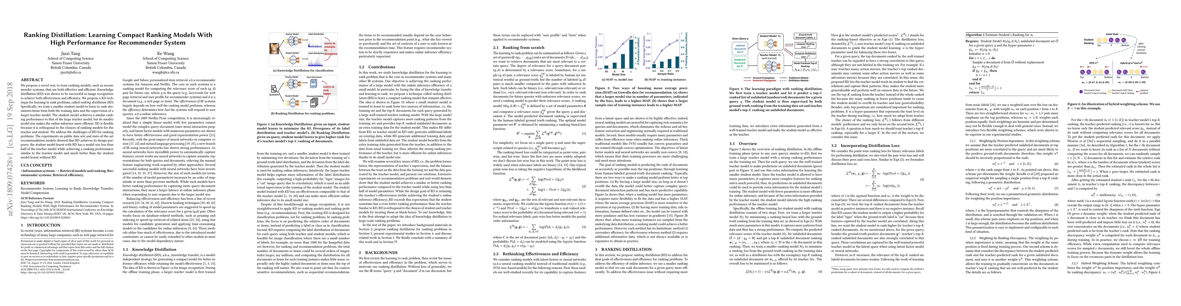 This paper introduces a novel ranking distillation technique for training compact yet efficient ranking models in recommender systems. The proposed method trains a smaller student model using knowledge from a larger teacher model, achieving similar performance while significantly reducing model size, thus enhancing inference efficiency.