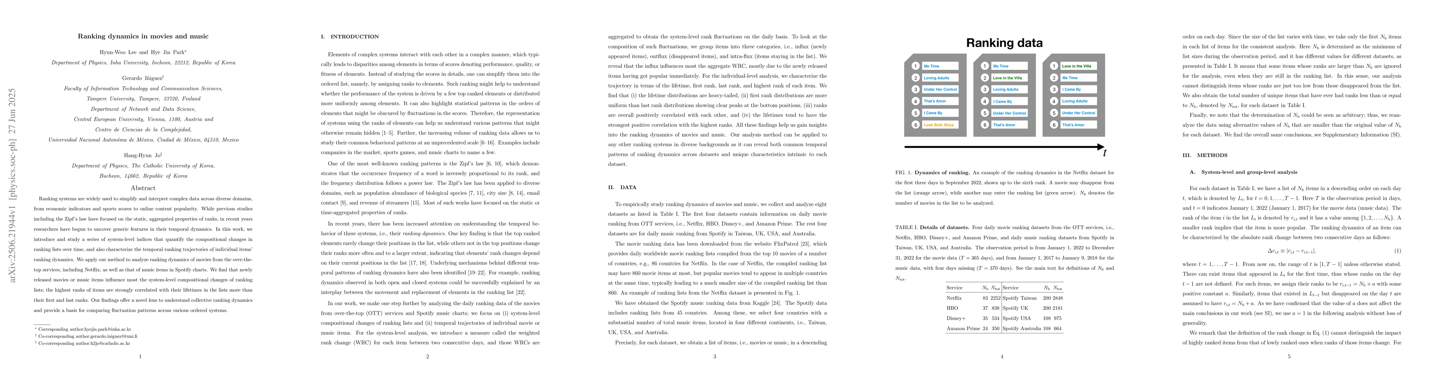 Ranking systems are widely used to simplify and interpret complex data across diverse domains, from economic indicators and sports scores to online content popularity. While previous studies including the Zipf's law have focused on the static, aggregated properties of ranks, in recent years researchers have begun to uncover generic features in their temporal dynamics. In this work, we introduce and study a series of system-level indices that quantify the compositional changes in ranking lists over time, and also characterize the temporal ranking trajectories of individual items' ranking dynamics. We apply our method to analyze ranking dynamics of movies from the over-the-top services, including Netflix, as well as that of music items in Spotify charts. We find that newly released movies or music items influence most the system-level compositional changes of ranking lists; the highest ranks of items are strongly correlated with their lifetimes in the lists more than their first and last ranks. Our findings offer a novel lens to understand collective ranking dynamics and provide a basis for comparing fluctuation patterns across various ordered systems.