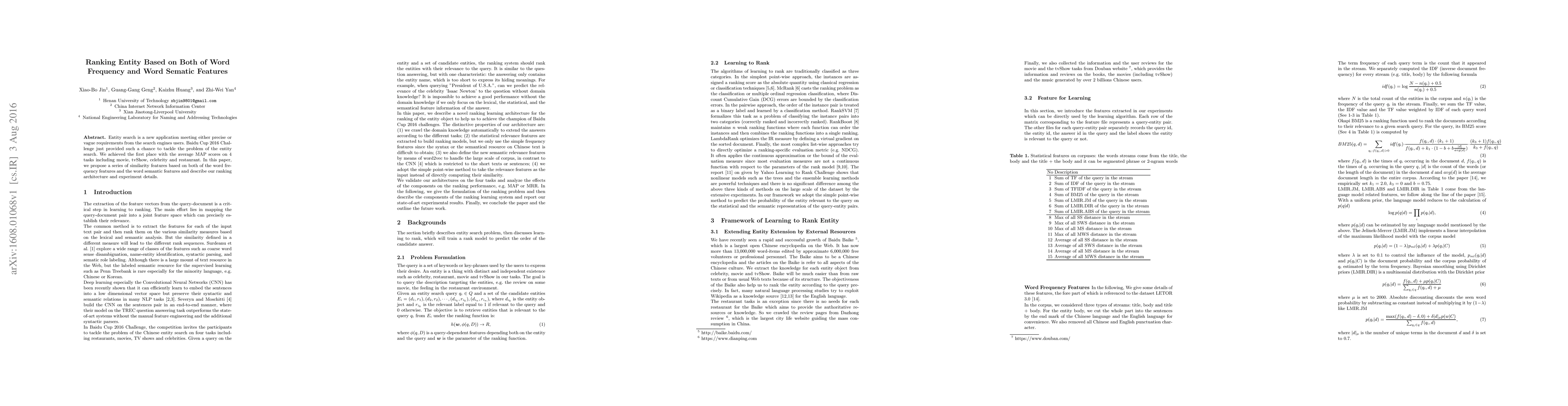 Entity search is a new application meeting either precise or vague requirements from the search engines users. Baidu Cup 2016 Challenge just provided such a chance to tackle the problem of the entity search. We achieved the first place with the average MAP scores on 4 tasks including movie, tvShow, celebrity and restaurant. In this paper, we propose a series of similarity features based on both of the word frequency features and the word semantic features and describe our ranking architecture and experiment details.