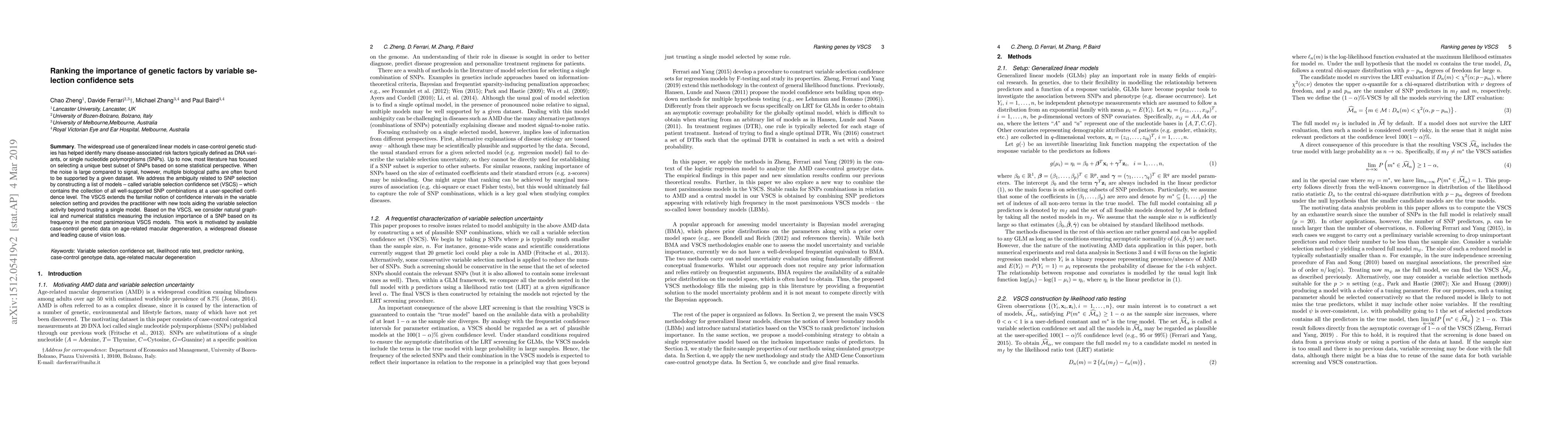The widespread use of generalized linear models in case-control genetic studies has helped identify many disease-associated risk factors typically defined as DNA variants, or single nucleotide polymorphisms (SNPs). Up to now, most literature has focused on selecting a unique best subset of SNPs based on some statistical perspectives. In the presence of pronounced noise, however, multiple biological paths are often found to be equally supported by a given dataset when dealing with complex genetic diseases. We address the ambiguity related to SNP selection by constructing a list of models called variable selection confidence set (VSCS), which contains the collection of all well-supported SNP combinations at a user-specified confidence level. The VSCS extends the familiar notion of confidence intervals in the variable selection setting and provides the practitioner with new tools aiding the variable selection activity beyond trusting a single model. Based on the VSCS, we consider natural graphical and numerical statistics measuring the inclusion importance of a SNP based on its frequency in the most parsimonious VSCS models. This work is motivated by available case-control genetic data on age-related macular degeneration, a widespread complex disease and leading cause of vision loss.