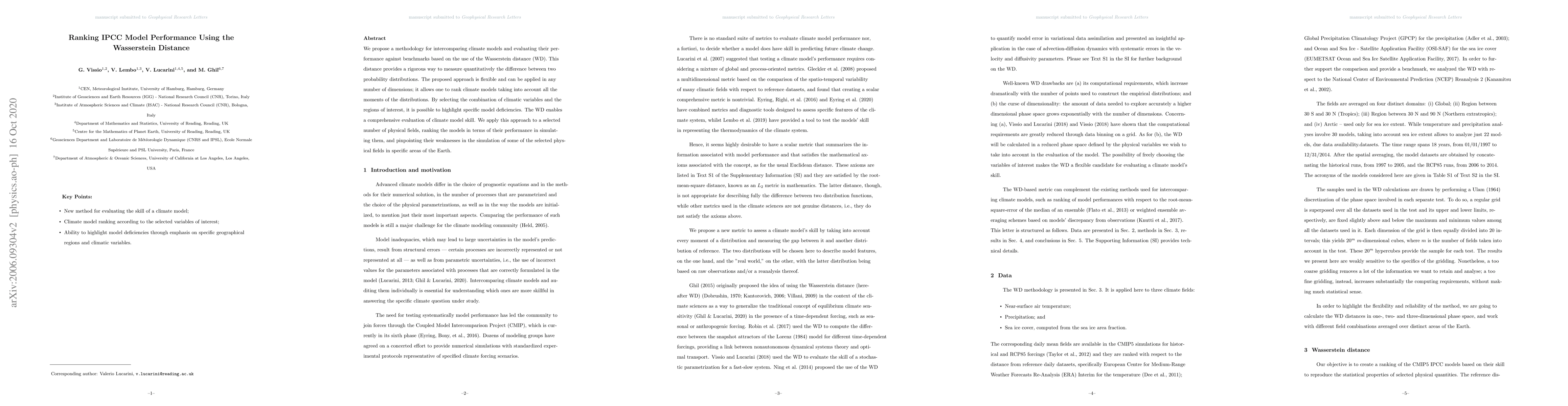 We propose a methodology for intercomparing climate models and evaluating their performance against benchmarks based on the use of the Wasserstein distance (WD). This distance provides a rigorous way to measure quantitatively the difference between two probability distributions. The proposed approach is flexible and can be applied in any number of dimensions; it allows one to rank climate models taking into account all the moments of the distributions. By selecting the combination of climatic variables and the regions of interest, it is possible to highlight specific model deficiencies. The WD enables a comprehensive evaluation of climate model skill. We apply this approach to a selected number of physical fields, ranking the models in terms of their performance in simulating them, and pinpointing their weaknesses in the simulation of some of the selected physical fields in specific areas of the Earth.