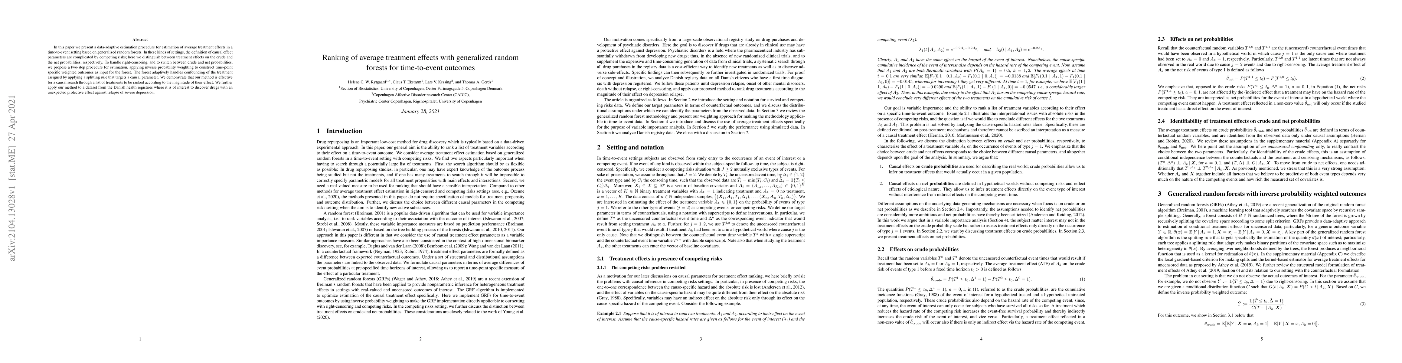 This paper introduces a data-adaptive method using generalized random forests to estimate average treatment effects in time-to-event settings, distinguishing between crude and net probabilities. It employs a two-step procedure with inverse probability weighting to manage right-censoring and confounding, demonstrating effectiveness in ranking treatments based on their effect magnitudes.