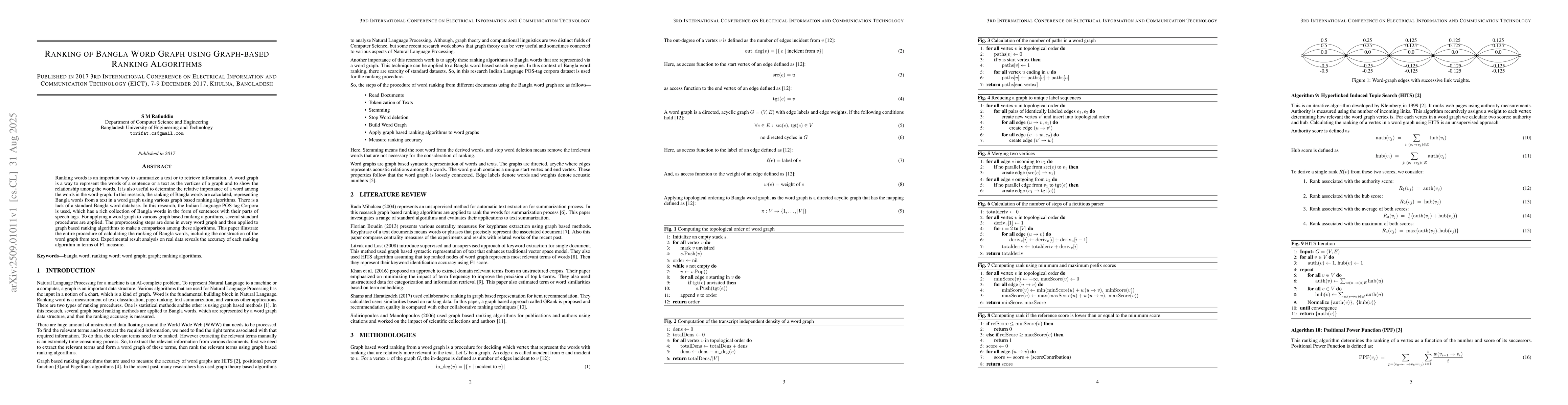 Ranking words is an important way to summarize a text or to retrieve information. A word graph is a way to represent the words of a sentence or a text as the vertices of a graph and to show the relationship among the words. It is also useful to determine the relative importance of a word among the words in the word-graph. In this research, the ranking of Bangla words are calculated, representing Bangla words from a text in a word graph using various graph based ranking algorithms. There is a lack of a standard Bangla word database. In this research, the Indian Language POS-tag Corpora is used, which has a rich collection of Bangla words in the form of sentences with their parts of speech tags. For applying a word graph to various graph based ranking algorithms, several standard procedures are applied. The preprocessing steps are done in every word graph and then applied to graph based ranking algorithms to make a comparison among these algorithms. This paper illustrate the entire procedure of calculating the ranking of Bangla words, including the construction of the word graph from text. Experimental result analysis on real data reveals the accuracy of each ranking algorithm in terms of F1 measure.