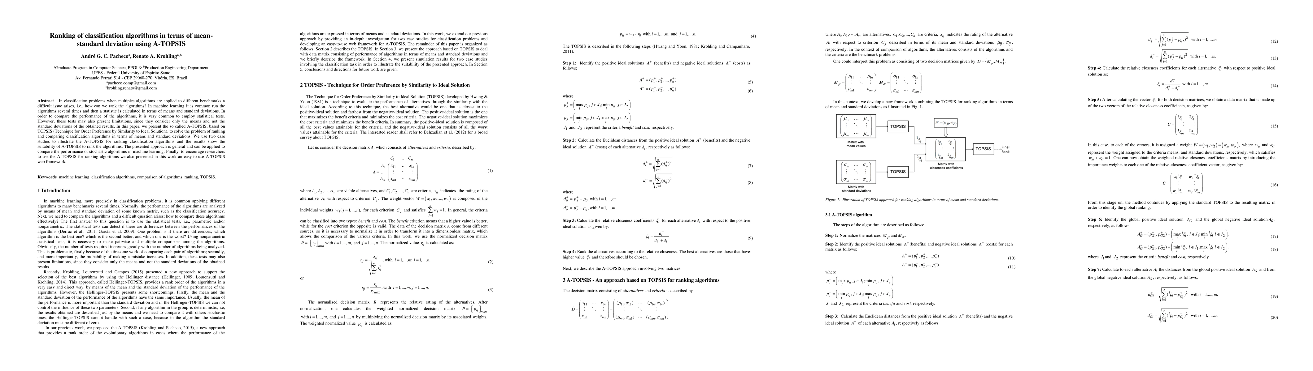 In classification problems when multiples algorithms are applied to different benchmarks a difficult issue arises, i.e., how can we rank the algorithms? In machine learning it is common run the algorithms several times and then a statistic is calculated in terms of means and standard deviations. In order to compare the performance of the algorithms, it is very common to employ statistical tests. However, these tests may also present limitations, since they consider only the means and not the standard deviations of the obtained results. In this paper, we present the so called A-TOPSIS, based on TOPSIS (Technique for Order Preference by Similarity to Ideal Solution), to solve the problem of ranking and comparing classification algorithms in terms of means and standard deviations. We use two case studies to illustrate the A-TOPSIS for ranking classification algorithms and the results show the suitability of A-TOPSIS to rank the algorithms. The presented approach is general and can be applied to compare the performance of stochastic algorithms in machine learning. Finally, to encourage researchers to use the A-TOPSIS for ranking algorithms we also presented in this work an easy-to-use A-TOPSIS web framework.