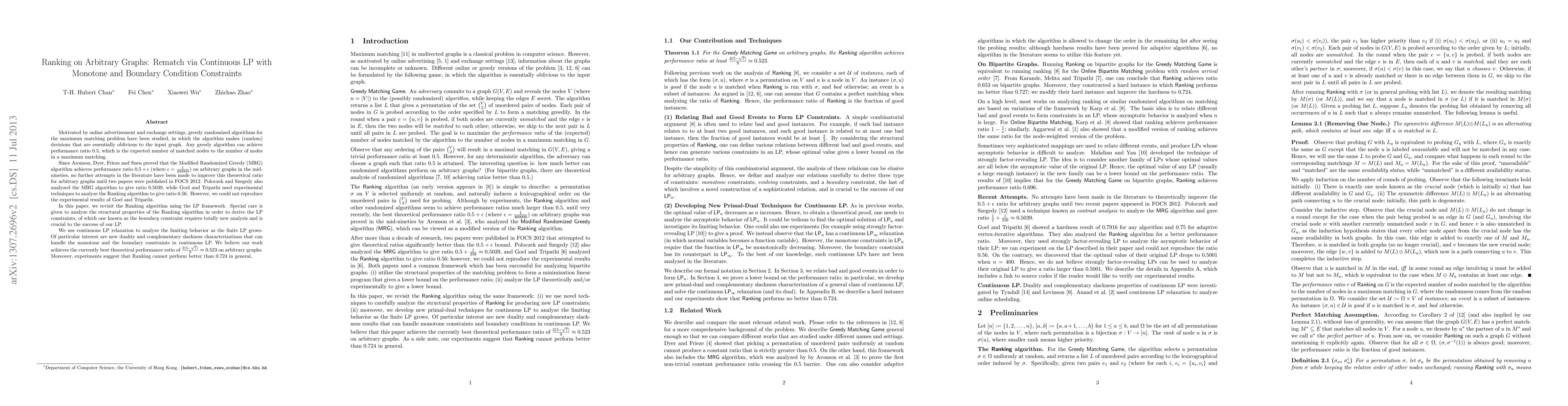 Researchers improved upon the Ranking algorithm for maximum matching on arbitrary graphs using continuous LP relaxation, achieving a theoretical performance ratio of approximately 0.523, and suggesting that the algorithm cannot perform better than 0.724 in general.