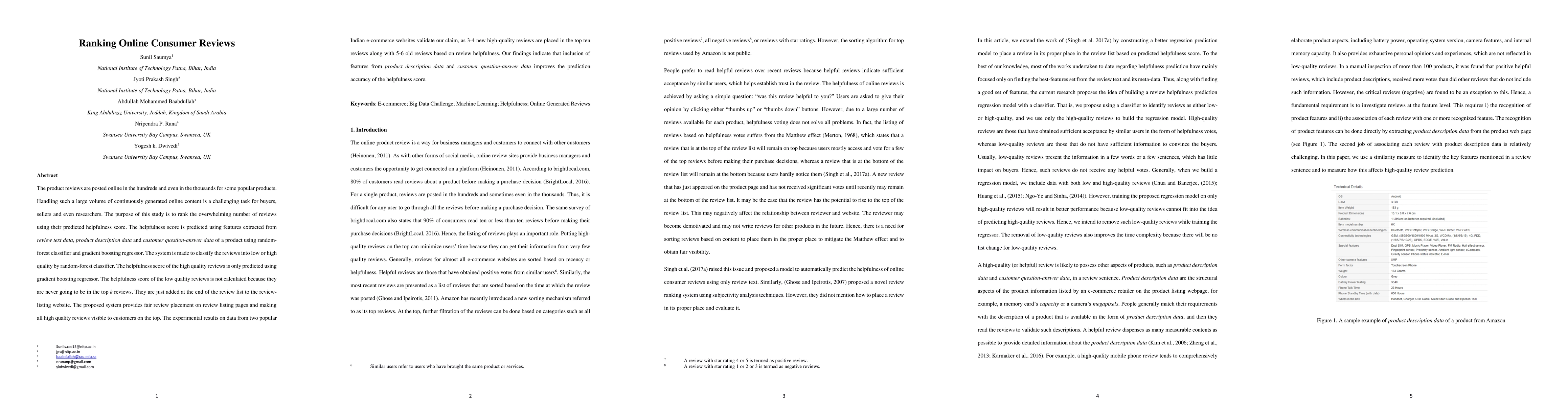 The product reviews are posted online in the hundreds and even in the thousands for some popular products. Handling such a large volume of continuously generated online content is a challenging task for buyers, sellers, and even researchers. The purpose of this study is to rank the overwhelming number of reviews using their predicted helpfulness score. The helpfulness score is predicted using features extracted from review text data, product description data and customer question-answer data of a product using random-forest classifier and gradient boosting regressor. The system is made to classify the reviews into low or high quality by random-forest classifier. The helpfulness score of the high-quality reviews is only predicted using gradient boosting regressor. The helpfulness score of the low-quality reviews is not calculated because they are never going to be in the top k reviews. They are just added at the end of the review list to the review-listing website. The proposed system provides fair review placement on review listing pages and making all high-quality reviews visible to customers on the top. The experimental results on data from two popular Indian e-commerce websites validate our claim, as 3-4 new high-quality reviews are placed in the top ten reviews along with 5-6 old reviews based on review helpfulness. Our findings indicate that inclusion of features from product description data and customer question-answer data improves the prediction accuracy of the helpfulness score.